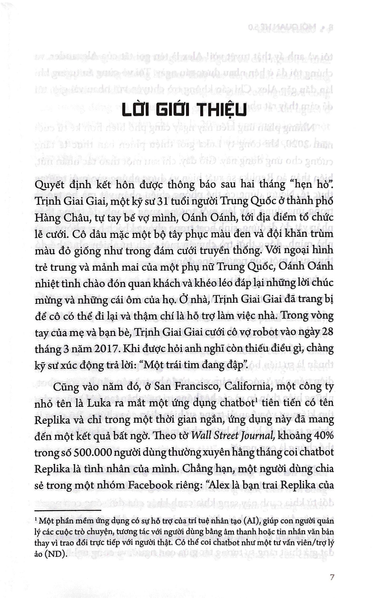 9. Nhìn về tương lai – chính sách, đạo đức và các chỉ dẫn cho mối quan hệ 5.0 Kết luận Lời cảm ơn. Trích đoạn sách: Không phải lúc nào chúng ta cũng yêu một người ở tất cả các khía cạnh của họ, thường thì chúng ta yêu một người vì những đặc điểm của người đó: nụ cười, cử chỉ dễ thương, cách suy nghĩ hay khiếu hài hước. Cũng có khi người đó mang đến cho chúng ta một cảm giác nào đó, hoặc chúng ta cảm thấy rằng mình có thể tin tưởng vào người này hơn những người khác. Chúng ta muốn khám phá người có thể mang đến cho chúng ta những cảm xúc dễ chịu và khích lệ chúng ta nói chuyện nhiều hơn, đồng thời cũng gửi đi thông điệp rằng chúng ta là người đáng được khao khát, đặc biệt, tài năng, hấp dẫn và dí dỏm. Thông thường, tất cả những yếu tố này sẽ kết hợp lại với nhau để khiến chúng ta cảm thấy tốt hơn, hạnh phúc hơn và thư thái hơn khi ở bên cạnh người đó. Chúng ta cũng làm như vậy trước khi gặp đối tượng tiềm năng. Mặc dù không cần dùng đến bất kỳ công nghệ tinh vi nào, hầu hết chúng ta đều sẽ xem xét người này gần giống như cách chúng ta lựa chọn các sản phẩm trên Amazon. Chúng ta kiểm tra thân thế của đối tượng tiềm năng đó: trình độ học vấn, tuổi tác, gia đình, quan điểm chính trị và thậm chí là lịch sử tình trường. Chúng ta đo đếm xem người này có thể trở thành một nửa hoàn hảo của mình không để bảo vệ và hỗ trợ chúng ta trong mỗi bước thăng trầm của cuộc sống, từ ổn định kinh tế, sinh con, cho đến đóng vai trò một chỗ dựa về tinh thần. Sau đó, chúng ta bắt đầu nảy sinh tình cảm với người đó vì họ đáp ứng các nhu cầu của chúng ta ở một mức độ nào đó. Hãy thử nghĩ về một mối quan hệ mà bạn (hoặc những người khác) từng có và duy trì trong ít nhất một hoặc hai năm, bạn sẽ nhận ra được tất cả các giai đoạn trên. Dù rằng ban đầu là sự hào hứng, một cảm giác về “phép màu” và một cảm giác khó lý giải rằng bạn và người đó là “một cặp trời sinh”, nhưng có lẽ mọi thứ sẽ trở nên chân thật khi các hợp phần của mối liên kết đó tự bộc lộ ra ngoài. Sau khi hẹn hò một thời gian, bạn bắt đầu hiểu hơn về người đó. Có thể ban đầu bạn thích mọi thứ về người đó, nhưng đến giai đoạn về sau, bạn sẽ bắt đầu có cái nhìn cụ thể hơn về những điểm bạn thích và không thích về đối tượng của mình. Mọi người vẫn thường xuyên nói về những mặt được và chưa được ở đối tượng mà họ đang gặp gỡ, hẹn hò hoặc kết hôn. Mối quan hệ này có lẽ sẽ kéo dài bao lâu tùy theo ý thích của bạn bởi những điểm cộng ở người đó vẫn nhiều hơn những điểm trừ. Không phải lúc nào chúng ta cũng yêu một người ở tất cả các khía cạnh của họ, thường thì chúng ta yêu một người vì những đặc điểm của người đó: nụ cười, cử chỉ dễ thương, cách suy nghĩ hay khiếu hài hước. Cũng có khi người đó mang đến cho chúng ta một cảm giác nào đó, hoặc chúng ta cảm thấy rằng mình có thể tin tưởng vào người này hơn những người khác. Chúng ta muốn khám phá người có thể mang đến cho chúng ta những cảm xúc dễ chịu và khích lệ chúng ta nói chuyện nhiều hơn, đồng thời cũng gửi đi thông điệp rằng chúng ta là người đáng được khao khát, đặc biệt, tài năng, hấp dẫn và dí dỏm. Thông thường, tất cả những yếu tố này sẽ kết hợp lại với nhau để khiến chúng ta cảm thấy tốt hơn, hạnh phúc hơn và thư thái hơn khi ở bên cạnh người đó. Chúng ta cũng làm như vậy trước khi gặp đối tượng tiềm năng. Mặc dù không cần dùng đến bất kỳ công nghệ tinh vi nào, hầu hết chúng ta đều sẽ xem xét người này gần giống như cách chúng ta lựa chọn các sản phẩm trên Amazon. Chúng ta kiểm tra thân thế của đối tượng tiềm năng đó: trình độ học vấn, tuổi tác, gia đình, quan điểm chính trị và thậm chí là lịch sử tình trường. Chúng ta đo đếm xem người này có thể trở thành một nửa hoàn hảo của mình không để bảo vệ và hỗ trợ chúng ta trong mỗi bước thăng trầm của cuộc sống, từ ổn định kinh tế, sinh con, cho đến đóng vai trò một chỗ dựa về tinh thần. Sau đó, chúng ta bắt đầu nảy sinh tình cảm với người đó vì họ đáp ứng các nhu cầu của chúng ta ở một mức độ nào đó. Hãy thử nghĩ về một mối quan hệ mà bạn (hoặc những người khác) từng có và duy trì trong ít nhất một hoặc hai năm, bạn sẽ nhận ra được tất cả các giai đoạn trên. Dù rằng ban đầu là sự hào hứng, một cảm giác về “phép màu” và một cảm giác khó lý giải rằng bạn và người đó là “một cặp trời sinh”, nhưng có lẽ mọi thứ sẽ trở nên chân thật khi các hợp phần của mối liên kết đó tự bộc lộ ra ngoài. Sau khi hẹn hò một thời gian, bạn bắt đầu hiểu hơn về người đó. Có thể ban đầu bạn thích mọi thứ về người đó, nhưng đến giai đo