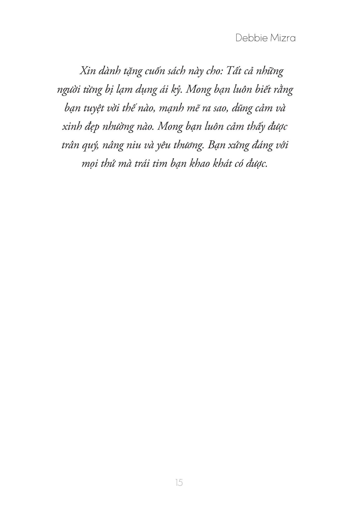 - Các bài tập giúp điều chỉnh hệ thống thần kinh của bạn sau nhiều năm bị tổn thương Những nhận xét về cuốn sách: Cuốn sách này sẽ giải đáp thỏa đáng những câu hỏi đầy dằn vặt sau: “Làm sao tôi lại để m.ình bị đối xử như vậy?” “Liệu tôi có bao giờ được trở lại là chính m.ình nữa không?” “Làm sao tôi biết nên tin ai?” -Abby Rodman, Nhà trị liệu tâm lý, người đồng dẫn chương trình podcast Sisters Cracking Up- Thông tin tác giả Debbie Mirza là huấn luyện viên phục hồi, tác giả và ca sĩ/nhạc sĩ. Trong quá trình huấn luyện của m.ình, cô đã có cơ hội làm việc trực tiếp với những người đã đang trong những mối quan hệ với những người ái kỷ bí mật. Chính vì thế, tác phẩm của cô tập trung giải thích đặc điểm của kiểu người ái kỷ quỷ quyệt nhất, từ đó xác định mức độ ảnh hưởng tiềm năng của chứng rối loạn này đến bạn và cách chữa lành nếu bạn vô tình rơi vào một mối quan hệ như thế