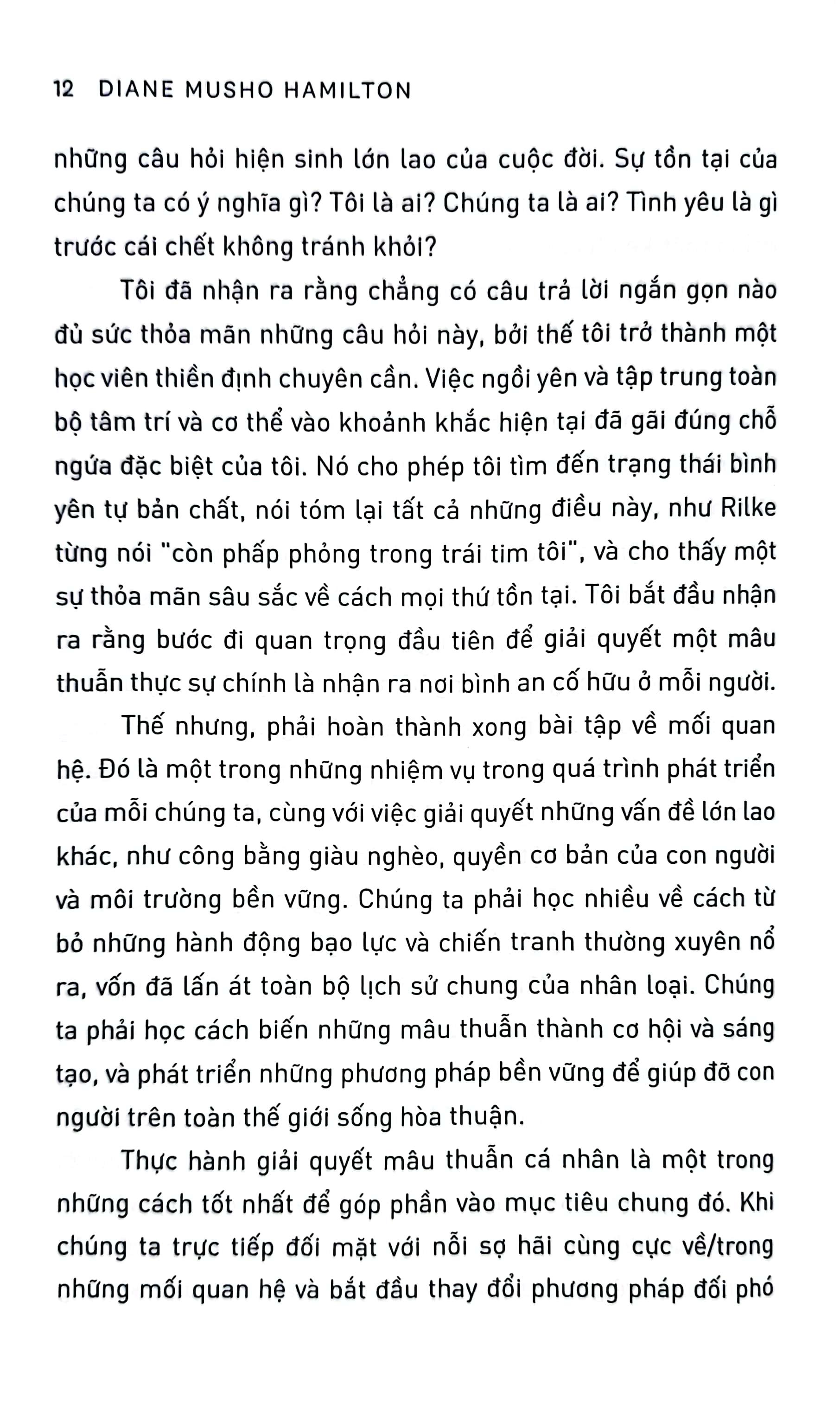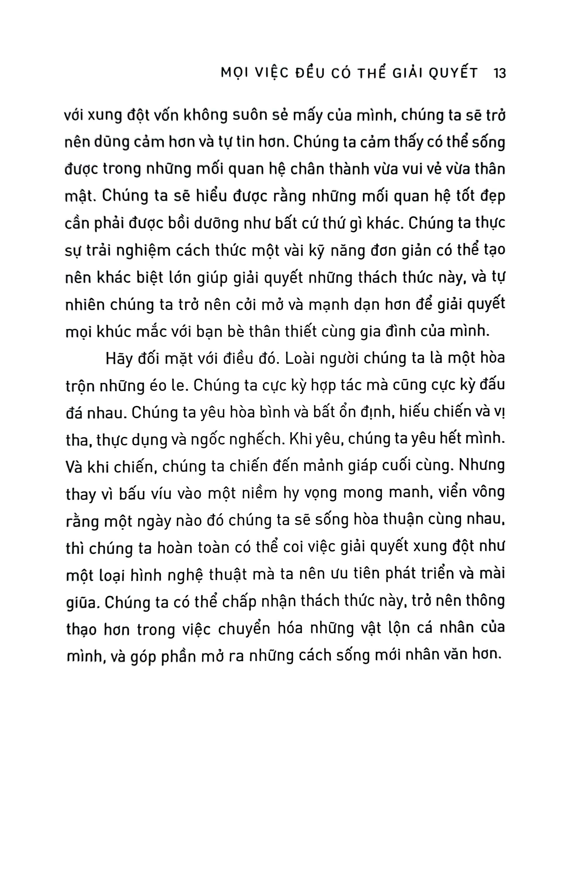 Cho dù những bất đồng, mâu thuẫn ấy có khó chịu đến đâu, đó vẫn là điều không thể tránh khỏi đối với trải nghiệm con người của chúng ta. Thay vì đối phó với nó trong tư thế đương đầu, ta sẽ học cách chung sống với nó và biến việc giải quyết xung đột thành một loại hình nghệ thuật, khiến ta trở nên kiên nhẫn hơn, sáng tạo hơn, chấp nhận những quan điểm đối lập, thấu hiểu mọi người xung quanh và chung sống hòa bình.