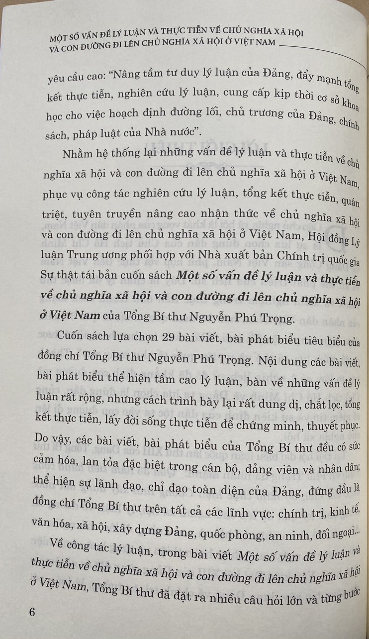 Nhằm hệ thống lại những vấn đề lý luận và thực tiễn về chủ nghĩa xã hội và con đường đi lên chủ nghĩa xã hội ở Việt Nam, phục vụ công tác nghiên cứu lý luận, tổng kết thực tiễn, quán triệt, tuyên truyền nâng cao nhận thức về chủ nghĩa xã hội và con đường đi lên chủ nghĩa xã hội ở Việt Nam, Hội đồng Lý luận Trung ương phối hợp với Nhà xuất bản Chính trị quốc gia Sự thật tái bản cuốn sách Một số vấn đề lý luận và thực tiền về chủ nghĩa xã hội và con đường đi lên chủ nghĩa xã hội ở Việt Nam của Tổng Bí thư Nguyễn Phú Trọng.