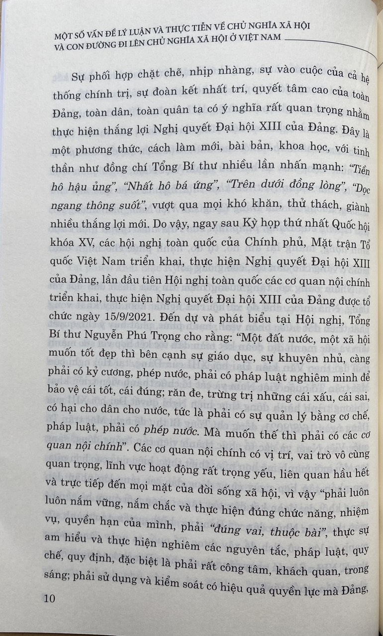 Tại Đại hội đại biểu toàn quốc lần thứ XIII của Đảng, Tổng Bí thư Nguyễn Phú Trọng đã nhấn mạnh: "Qua 35 năm tiến hành công cuộc đổi mới, 30 năm thực hiện Cương lĩnh xây dựng đất nước trong thời kỳ quá độ lên chủ nghĩa xã hội, lý luận về đường lối đổi mới, về chủ nghĩa xã hội và con đường đi lên chủ nghĩa xã hội ở nước ta ngày càng được hoàn thiện và từng bước được hiện thực hóa". Văn kiện Đại hội XIII của Đảng cũng đặt ra nhiệm vụ cho công tác xây dựng Đảng về chính trị, tư tưởng, lý luận với yêu cầu cao: "Nâng tâm tư duy lý luận của Đảng, đấy mạnh tổng kết thực tiễn, nghiên cưu lý luận, cung cấp kịp thời cơ sở khoa học cho việc hoạch định đường lổi, chủ trương của Đảng, chính sách, pháp luật của Nhà nước".