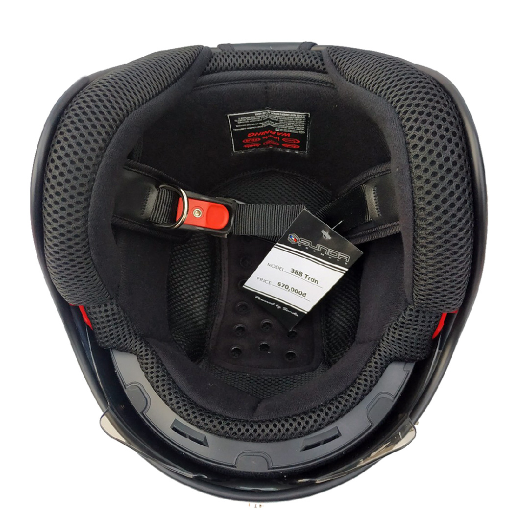 • Mũ bảo hiểm Sunda 388 thuộc phân khúc nón 3/4 cao cấp của SUNDA được trang bị lớp kính giấu bên trong, có thể kéo ra giấu vào tùy theo nhu cầu sử dụng.