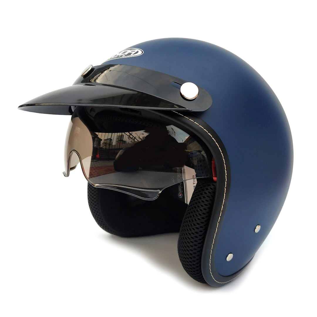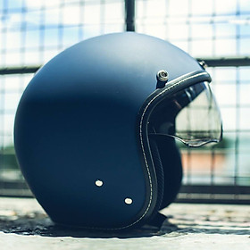 - Phong cách thiết kế: mũ kiểu 3/4 kèm kính dài, mũ được thiết kế dáng tròn, đi kèm 2 miếng ốp má, giúp tăng thêm hiệu quả bao phủ, bảo vệ khuôn mặt. -