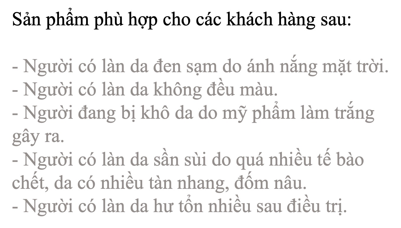 Đặc điểm sản phẩm:  Với thành phần chính là  DNA Cá Hồi và Abutin,( hợp chất làm trắng da) và các thành phần bổ trợ được chiết xuất từ thực vật,cùng Glutathione, Axit hyaluronic tế bào dưỡng