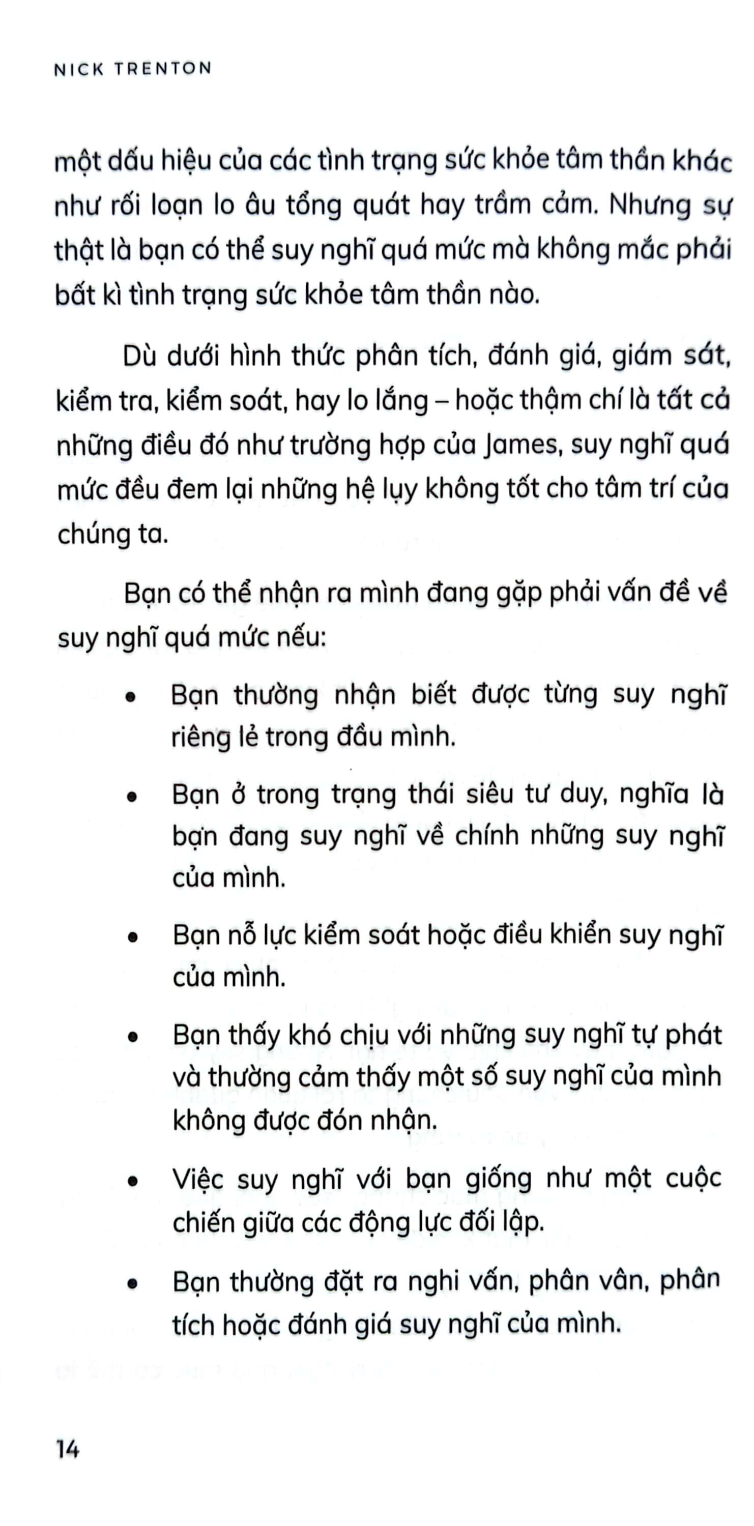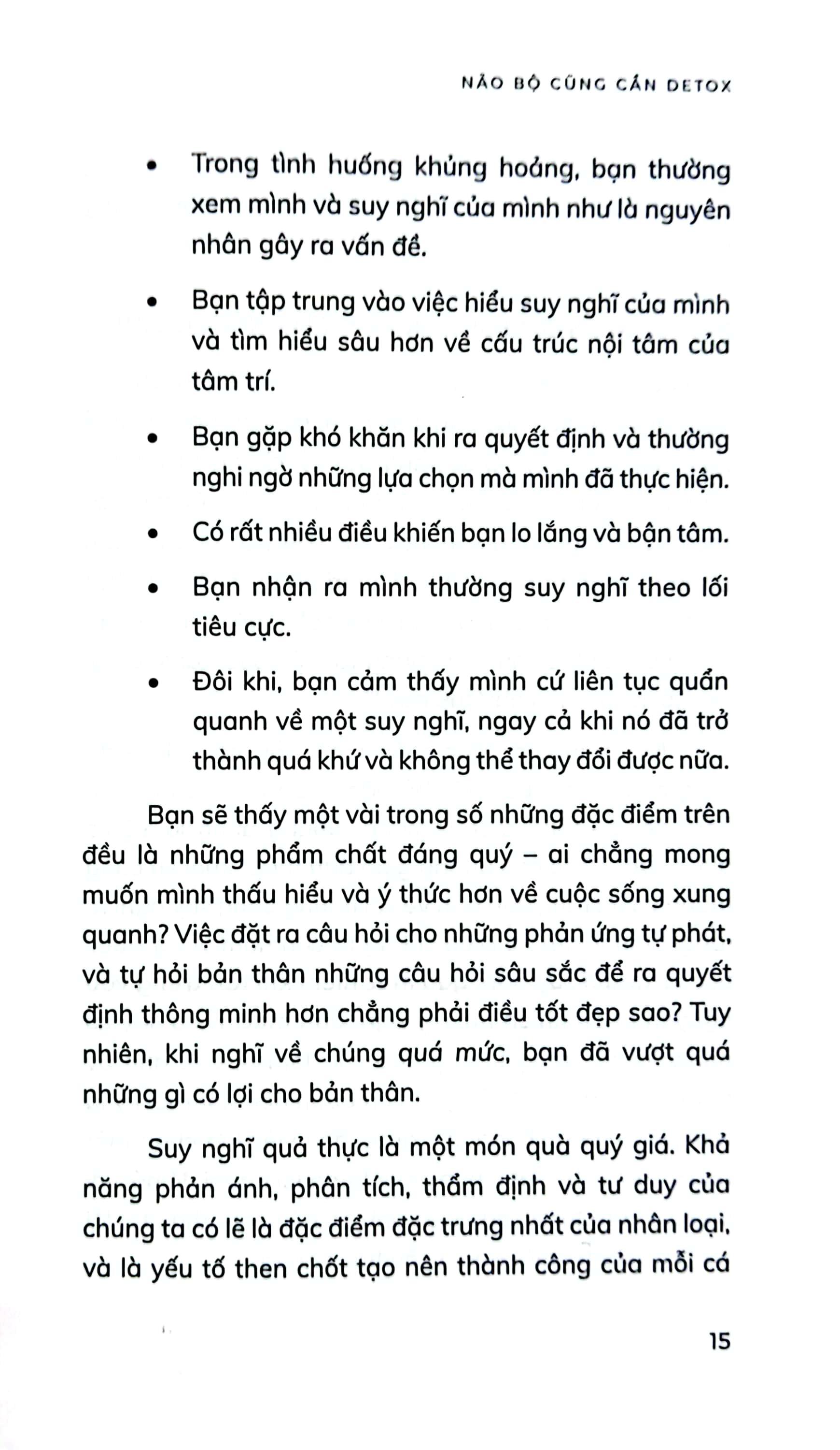 - Nội dung chính: Cuốn sách phân tích và tìm ra nguyên nhân của những lo lắng và suy nghĩ quá mức của con người trong cuộc sống hiện đại. Từ đó hướng dẫn bạn vượt qua các trở ngại bằng các kỹ thuật chi tiết và đã được chứng minh để giúp bạn thiết lập lại bộ não, kiểm soát suy nghĩ và thay đổi thói quen tinh thần của m.ình. Hơn nữa, cuốn sách sẽ cung cấp cho bạn các phương pháp khoa học để thay đổi hoàn toàn cách bạn suy nghĩ và cảm nhận về bản thân bằng cách chấm dứt những kiểu suy nghĩ luẩn quẩn. Bước ra khỏi cuốn sách bạn sẽ khám phá: