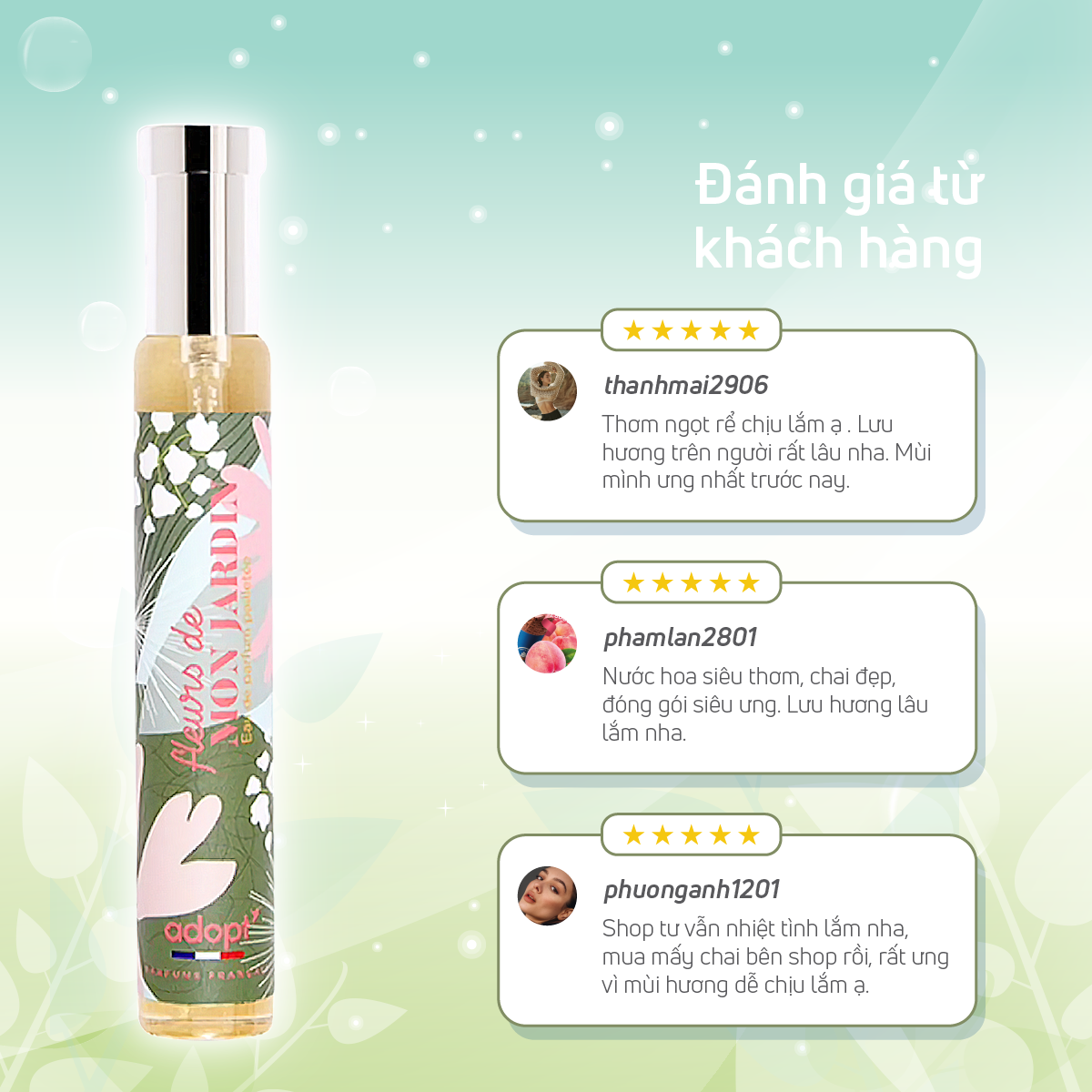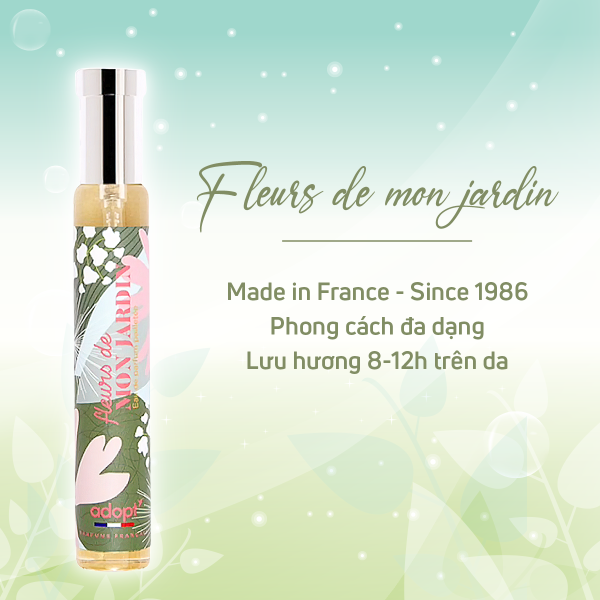 - 98% nguyên liệu thiên nhiên được sản xuất trực tiếp từ kinh đô nước hoa Grasses Dạo bước trong khu vườn hoa của Adopt’ với hương thơm Fleur de Mon Jardin. Hương thơm ngọt ngào kiêu sa của hoa mộc lan được hòa quyện cùng hương hoa táo tinh khiết thêm chút hương tựa trái mơ của hoa mộc. Tất cả được điểm xuyết lại với vị mặn nhẹ của muối. Một hương thơm ngọt ngào, dịu êm của cả một vườn hoa vô cùng trong trẻo và tươi mới. HƯỚNG DẪN SỬ DỤNG