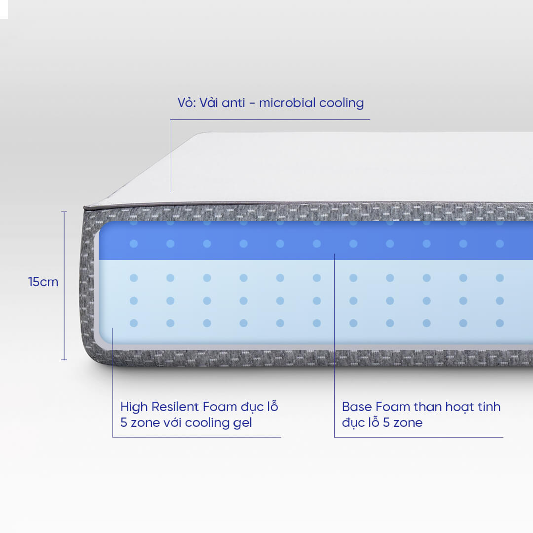 Công nghệ Cooling Gel được ứng dụng vào lõi PU Foam nằm gần sát bề mặt nệm, tạo hiệu quả điều hòa thân nhiệt sâu suốt đêm, kết hợp cùng sợi Cool Polyamide ở lớp vỏ áo nệm - tiếp xúc trực tiếp với cơ thể để tăng khả năng làm mát nhanh chóng. Đồng thời, lớp Base Foam bên dưới có thiết kế đục lỗ tạo khoảng không cho khí lưu thông tối đa. Nhờ đó, toàn bộ nệm với độ dày 15cm luôn giữ được sự thoáng khí và thoát ẩm cao trong mọi điều kiện thời tiết.