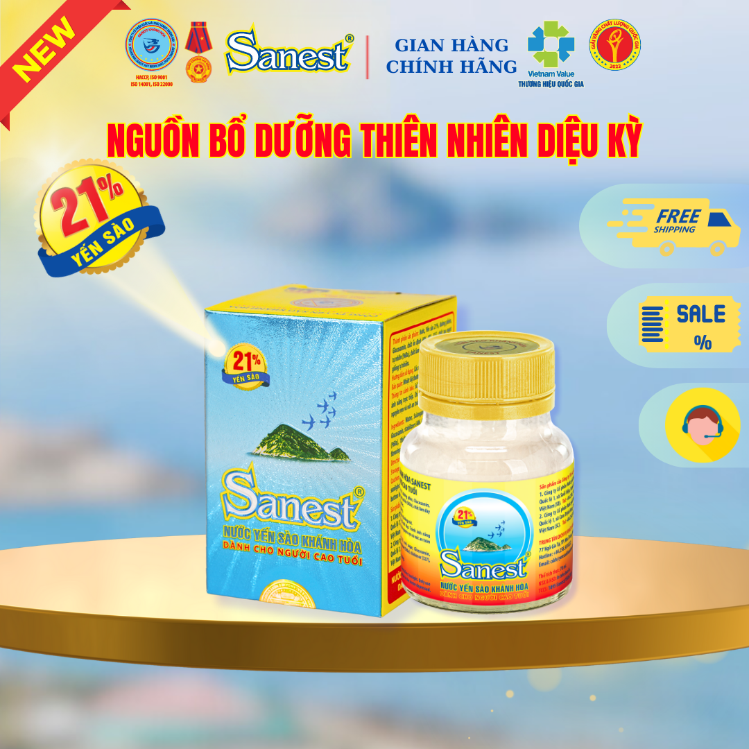 Nước Yến sào Khánh Hòa Sanest dành cho người cao tuổi được chế biến theo phương pháp cổ truyền kết hợp với khoa học công nghệ hiện đại trên dây chuyền thiết bị kỹ thuật tiên tiến của Châu Âu.