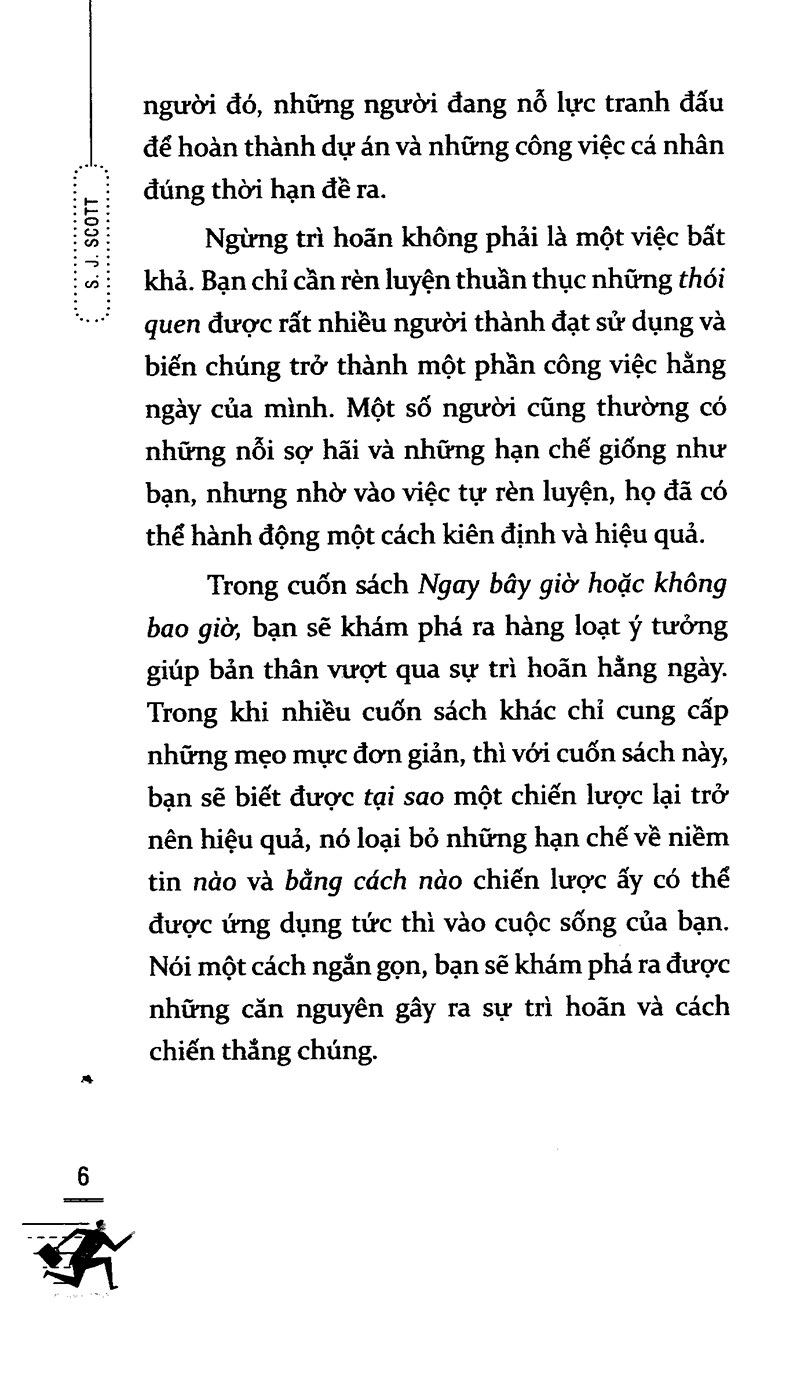 Thành công chỉ thực sự đến khi bạn giữ một lòng kiên trì sắt đá với những mục tiêu đã được đặt ra. Trong cuốn sách này, J. S. Scott đã cung cấp chi tiết những kế hoạch hành động trên mọi lĩnh vực của cuộc sống hằng ngày: từ chăm sóc sức khỏe, thể dục, công việc cho tới các mối quan hệ cá nhân. Không giống như các cuốn sách rèn luyện kỹ năng tầm thường khác, nội dung cuốn sách tập trung tối đa vào hai chữ “hành động”. Vì vậy, thay vì phải đọc những lời khuyên chung chung, bạn sẽ nhận được những phương pháp có thể được thực hiện ngay lập tức nhằm tạo lập những thói quen có thể đánh bại sự trì hoãn .
