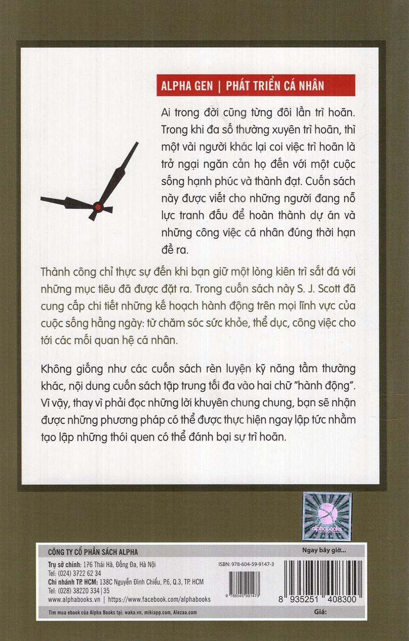Thành công chỉ thực sự đến khi bạn giữ một lòng kiên trì sắt đá với những mục tiêu đã được đặt ra. Trong cuốn sách này, J. S. Scott đã cung cấp chi tiết những kế hoạch hành động trên mọi lĩnh vực của cuộc sống hằng ngày: từ chăm sóc sức khỏe, thể dục, công việc cho tới các mối quan hệ cá nhân. Không giống như các cuốn sách rèn luyện kỹ năng tầm thường khác, nội dung cuốn sách tập trung tối đa vào hai chữ “hành động”. Vì vậy, thay vì phải đọc những lời khuyên chung chung, bạn sẽ nhận được những phương pháp có thể được thực hiện ngay lập tức nhằm tạo lập những thói quen có thể đánh bại sự trì hoãn .