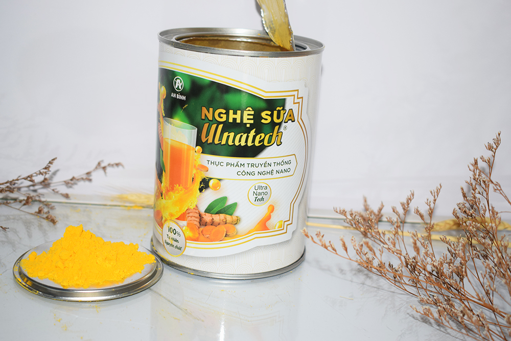 NGHỆ SỮA ULNATECH. Tên sản phẩm: Nghệ sữa Nano Ulnatech. Dạng bột. Màu sắc: Vàng cam. Thành phần: Tinh nghệ nano curcumin, Sữa nhập khẩu tách béo Newzealand. Hàm lượng Nano Curcumin: 23.000mg/kg Công nghệ sử dụng: Công nghệ nano vật lý, không dung môi hóa học, không chất bảo quản. Sản xuất: Công ty Dược Hoàng Kỳ. CÔNG DỤNG SẢN PHẨM