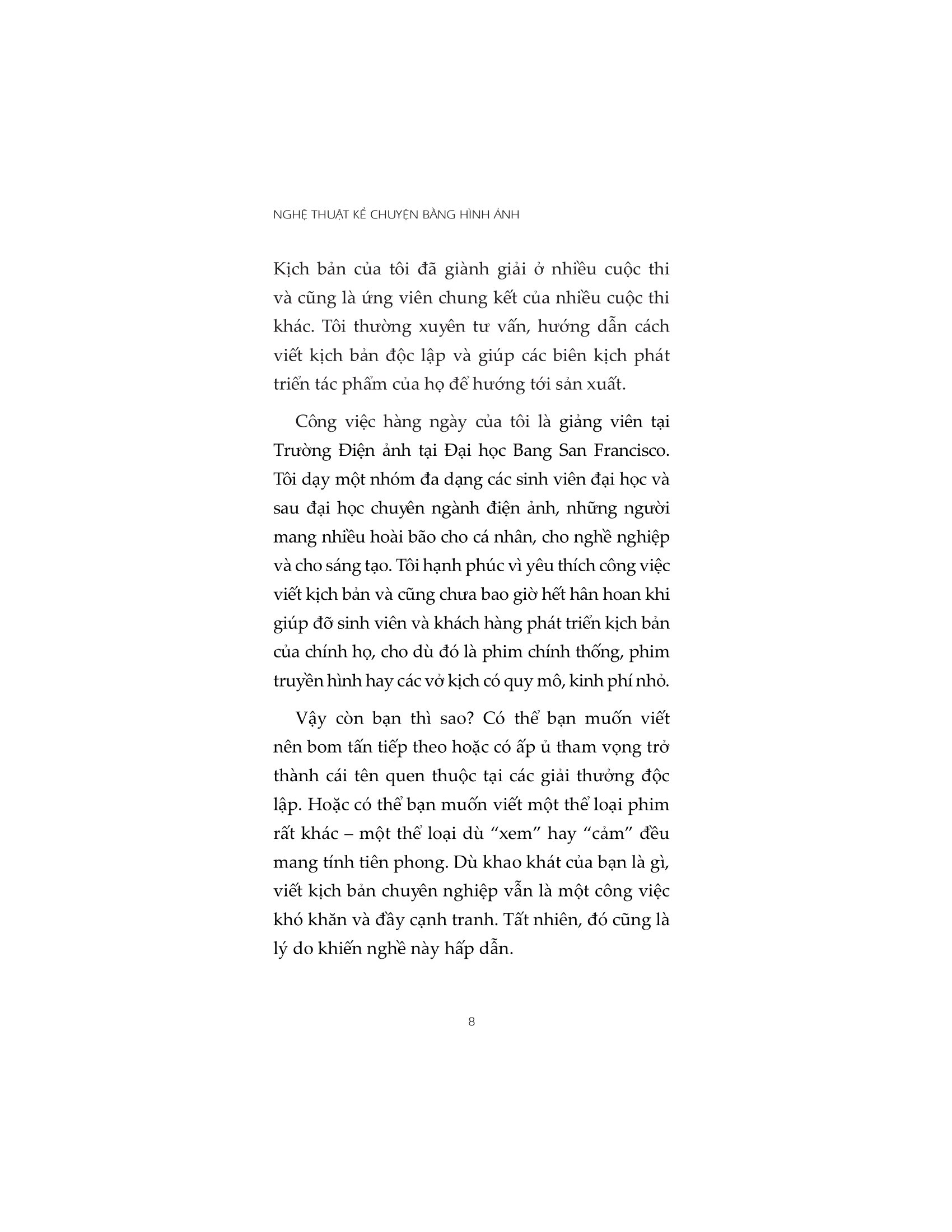 Nếu bạn đang mong muốn trở thành một nhà biên kịch tài ba, và mong muốn viết nên những tác bom tấn hoặc có ấp ủ tham vọng trở thành cái tên quen thuộc tại các giải thưởng độc lập thì cuốn sách này sẽ là một công cụ hỗ trợ giúp bạn làm được điều đó. “Nghệ thuật kể chuyện bằng hình ảnh” chắt lọc kỹ kể chuyện thành 12 yếu tố chính, từ phát triển câu chuyện đến sửa đổi và viết lại, cùng với rất nhiều cảm hứng để tự tin, sáng tạo, cũng như giúp bạn hiểu thêm về những gì các biên kịch chuyên nghiệp đang làm.