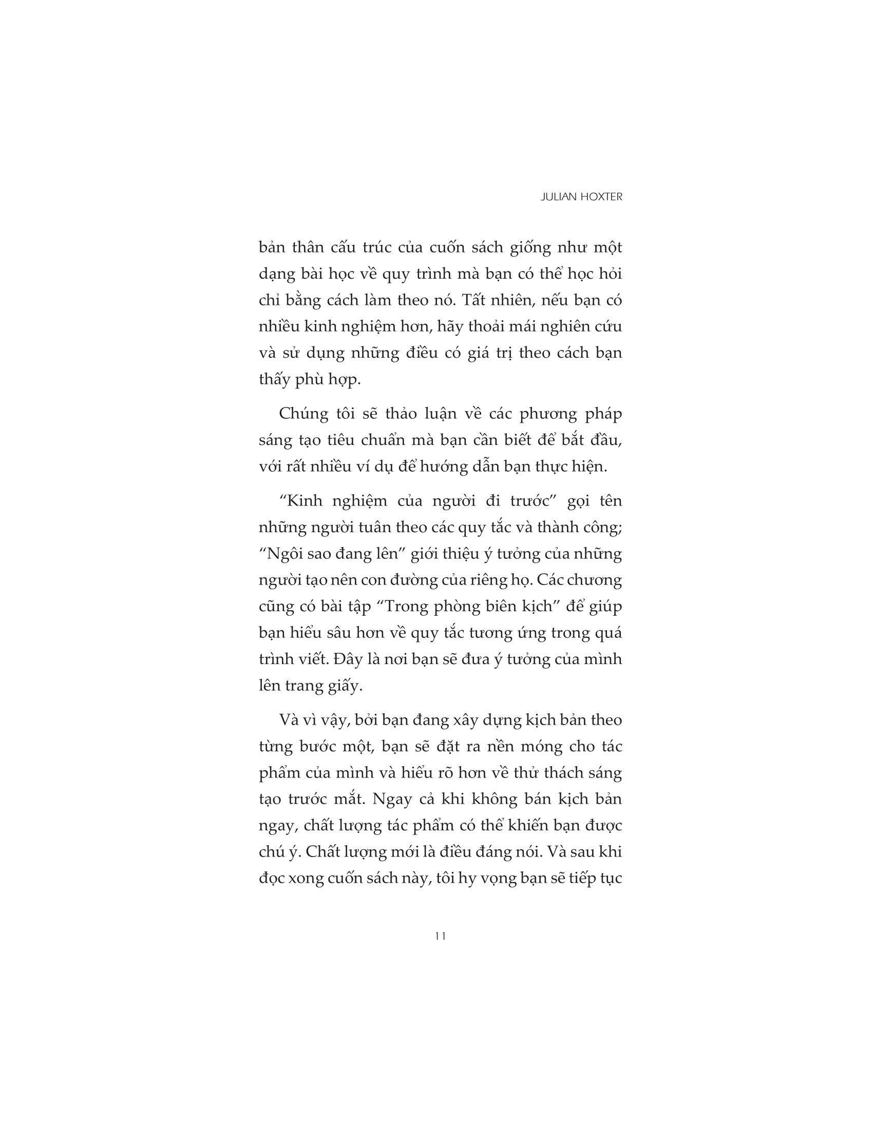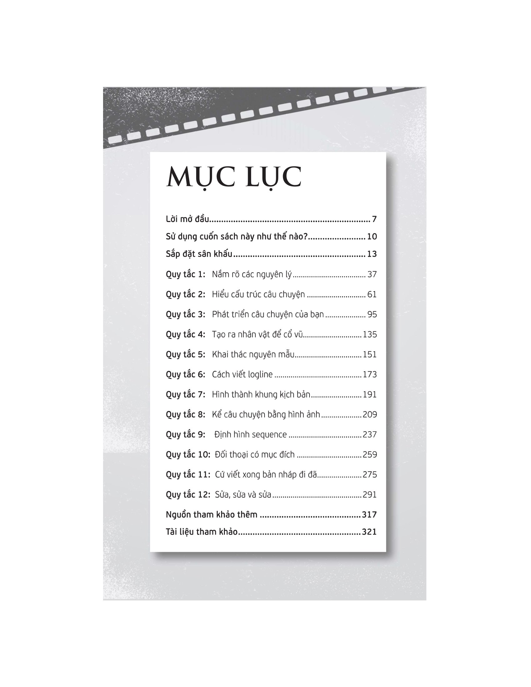 Cuốn sách còn đưa bạn khám phá ngành công nghiệp điện ảnh Hollywood: cách thức nó phát triển, hậu trường của những bộ phim mang tính biểu tượng cùng với những bộ phim thử nghiệm của các biên kịch sáng tạo đã vượt qua các quy tắc và mở con đường cho riêng mình lên màn ảnh vàng. Khi bước sang phần thú vị hơn—viết—chúng ta có các quy tắc đã được thử và cho thấy hiệu quả. Mỗi chương đều có kèm theo một bài tập sáng tạo để giúp bạn hiểu sâu hơn về điều gì khiến một kịch bản trở nên sống động.