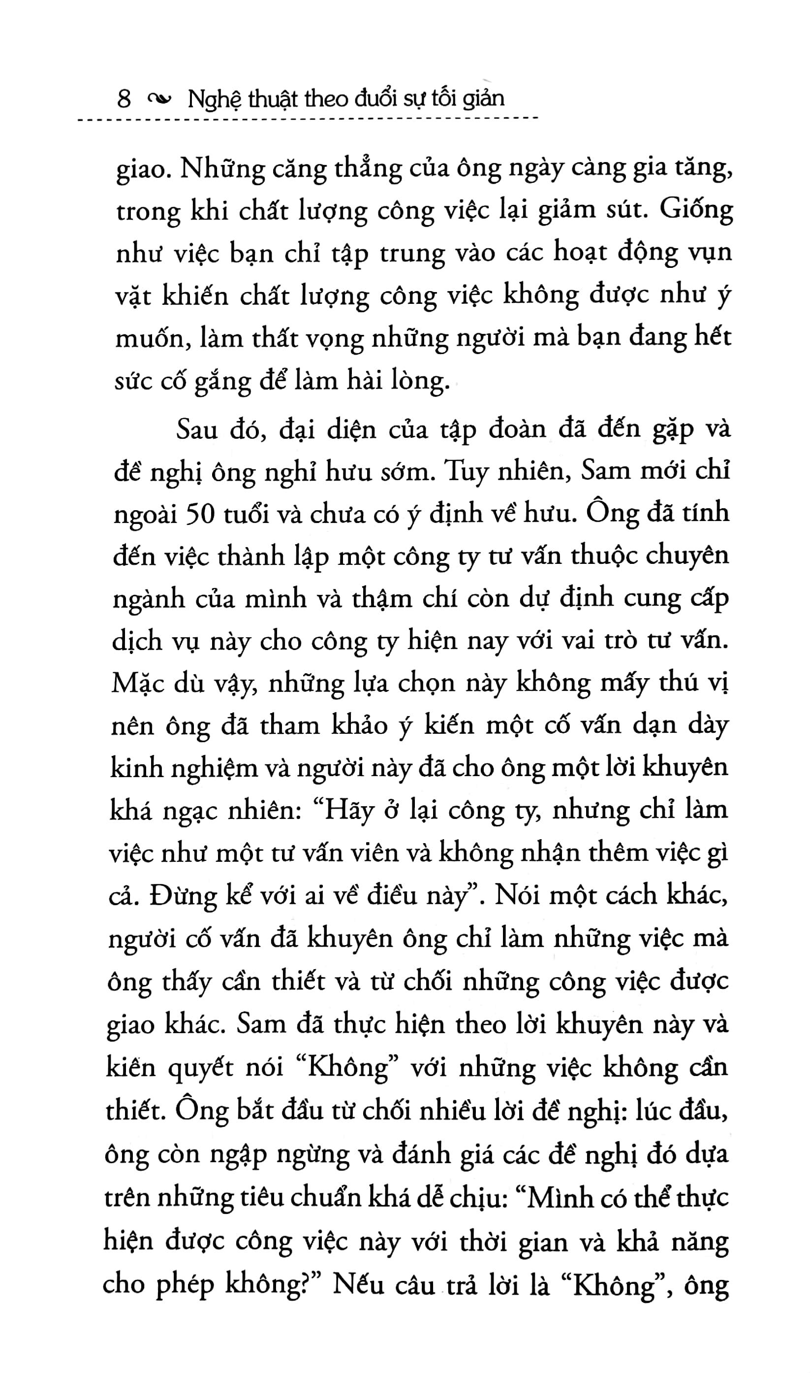 Greg kể rất nhiều câu chuyện về những người nói “Có” với các câu hỏi trên, từ những nhân viên bình thường đến nhà lãnh đạo của các công ty lớn, đặc biệt là lớp người thứ hai. Họ là nô lệ của chiếc điện thoại, tài liệu chồng chất, những cuộc họp vô nghĩa hàng tuần, những cuộc hẹn mà họ biết rằng không đem lại điều gì,… Tóm lại, điểm chung của họ là không ngừng cố gắng, làm việc nhiều hơn, nhiều hơn nữa nhưng kết quả thì vẫn không thể tiến thêm bước nào. Điều tồi tệ nhất chính là họ không hề cảm thấy hạnh phúc khi không còn thời gian cho những điều thực sự quan trọng trong cuộc đời và thời gian cho chính bản thân m.ình.