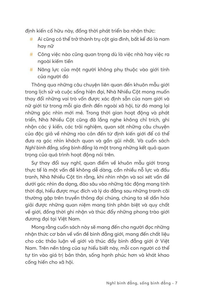 Nhằm mục đích thúc đẩy nhận thức về bình đẳng giới, khuyến khích mỗi cá nhân và cả xã hội vượt qua những định kiến giới, Nghĩ bình đẳng, sống bình đẳng là thành quả sau nhiều năm hoạt động bền bỉ của dự án Nhà Nhiều Cột. Cuốn sách giới thiệu và cập nhật những kiến thức đa dạng, hiện đại về giới và bình đẳng giới, cung cấp tri thức nền tảng về vấn đề giới. Cùng với đó, những phân tích, bình luận về các sự kiện thực tế nóng hổi trên báo chí đương đại cũng có ý nghĩa quan trọng trong việc nhận diện, phê phán các hiện tượng bất bình đẳng giới đang tồn tại.