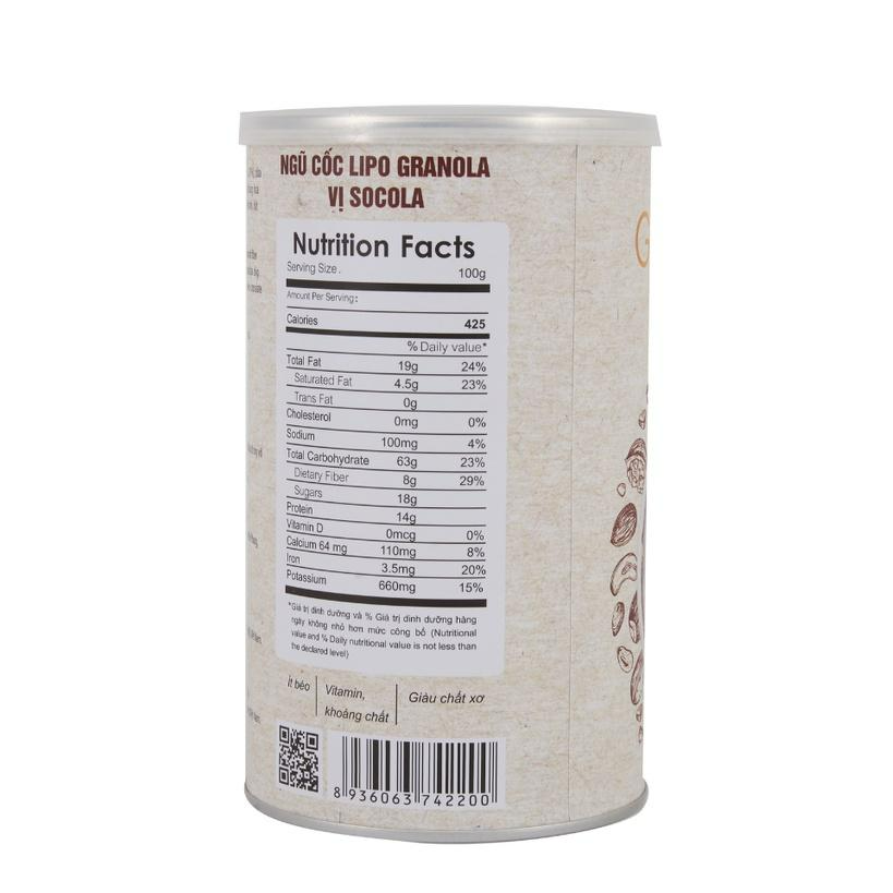 Mua tại TiktokNgũ cốc dinh dưỡng Granola Lipo 300g vị Chocolate Vị đắng nhẹ tinh tế của những viên chocolate đen, hương thơm nồng nàn từ bột cacao thượng hạng, vị bùi từ hạt hạnh nhân - có thể nói đây là một trong những vị Granola thực sự tuyệt vời mà bất kì ai cũng sẽ mê ngay từ lần nếm đầu tiên. Vừa ăn ngon vừa đẹp dáng với Lipo Healthy Food ngay thôi! THÔNG TIN SẢN PHẨM: