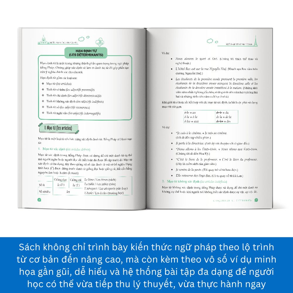 Sách không chỉ trình bày kiến thức ngữ pháp theo lộ trình từ cơ bản đến nâng cao, mà còn kèm theo vô số ví dụ minh họa gần gũi, dễ hiểu và hệ thống bài tập đa dạng để người học có thể vừa tiếp thu lý thuyết, vừa thực hành ngay. Chính nhờ cách tiếp cận này, cuốn sách mang lại cảm giác học tập chủ động, giúp người học nhanh chóng nắm bắt cấu trúc ngữ pháp, tránh tình trạng học vẹt hay học xong lại quên. Với sự kết hợp hài hòa giữa lý thuyết, ví dụ và luyện tập, “Ngữ pháp tiếng Pháp cơ bản” thực sự là người bạn đồng hành lý tưởng cho mọi đối tượng – từ học sinh, sinh viên cho đến người đi làm, hay bất kỳ ai mới bắt đầu hành trình chinh phục tiếng Pháp.