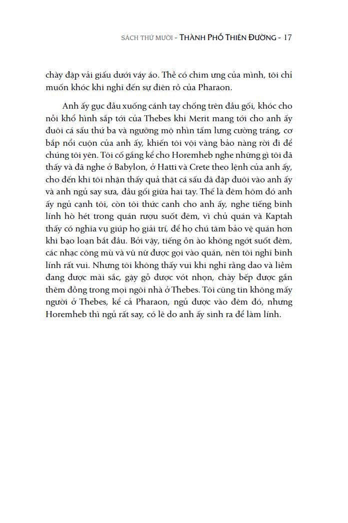 Thất vọng trước số phận, Sinuhe viết 15 chương sách kể lại những trải nghiệm và những sự kiện lịch sử mà m.ình chứng kiến, với đủ tất cả các gia vị của cuộc đời từ hạnh phúc, vinh quang đến khốn khổ, cô đơn.