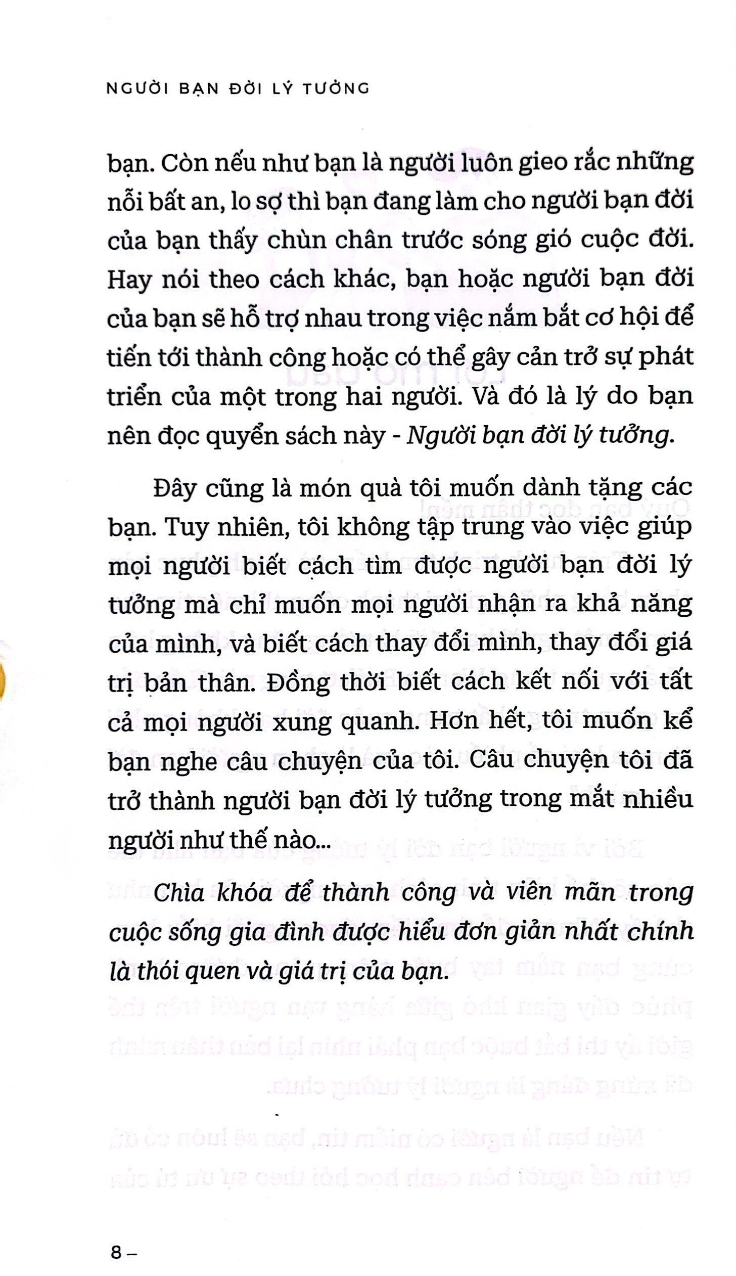 Bất kể bạn là nam hay nữ, đã kết hôn hay chưa kết hôn thì Người Bạn Đời Lý Tưởng cũng là cuốn sách bạn nên đọc ít nhất một lần. Bởi bạn sẽ biết cách làm thế nào để tìm kiếm được người bạn đời lý tưởng nhất, phù hợp nhất cho riêng m.ình nếu bạn chưa lập gia đình, và làm thế nào để người bạn đời của m.ình trở nên lý tưởng nếu bạn đã lập gia đình.