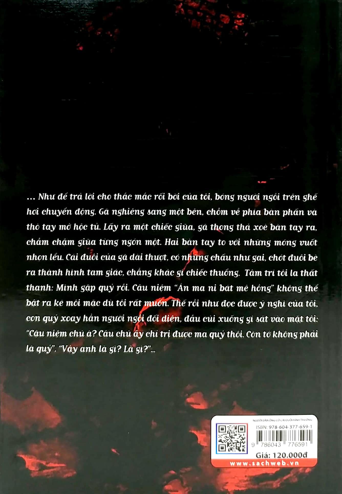 Như để trả lời cho thắc mắc rối bời của tôi, bóng người ngồi trên ghế hơi chuyển động. Gã nghiêng sang một bên, chồm về phía bàn phản và thò tay mở hộc tủ. Lấy ra một chiếc giữa, gã thong thả xoè bàn tay ra, chầm chậm giũa từng ngón một. Hai bàn tay to với những móng vuốt nhọn lều. Cái đuôi của gã dài thượt, có những chấu như gai, chót đuôi bè ra thành hình tam giác, chẳng khác gì chiếc thuồng. Tâm trí tôi la thất thanh: Mình gặp quỷ rồi. Câu niệm “Án ma ni bát mê hồng” không thể bật ra kẽ môi mặc dù tôi rất muốn. Thế rồi như đọc được ý nghi của tôi, con quỷ xoay hẳn người ngồi đối diện, đầu cúi xuống gí sát vào mặt tôi: “Cậu niệm chủ à? Câu chủ ấy chỉ trị được ma quỷ thôi. Còn tớ không phải là quỷ”. “Vậy anh là gì? Là gì?”