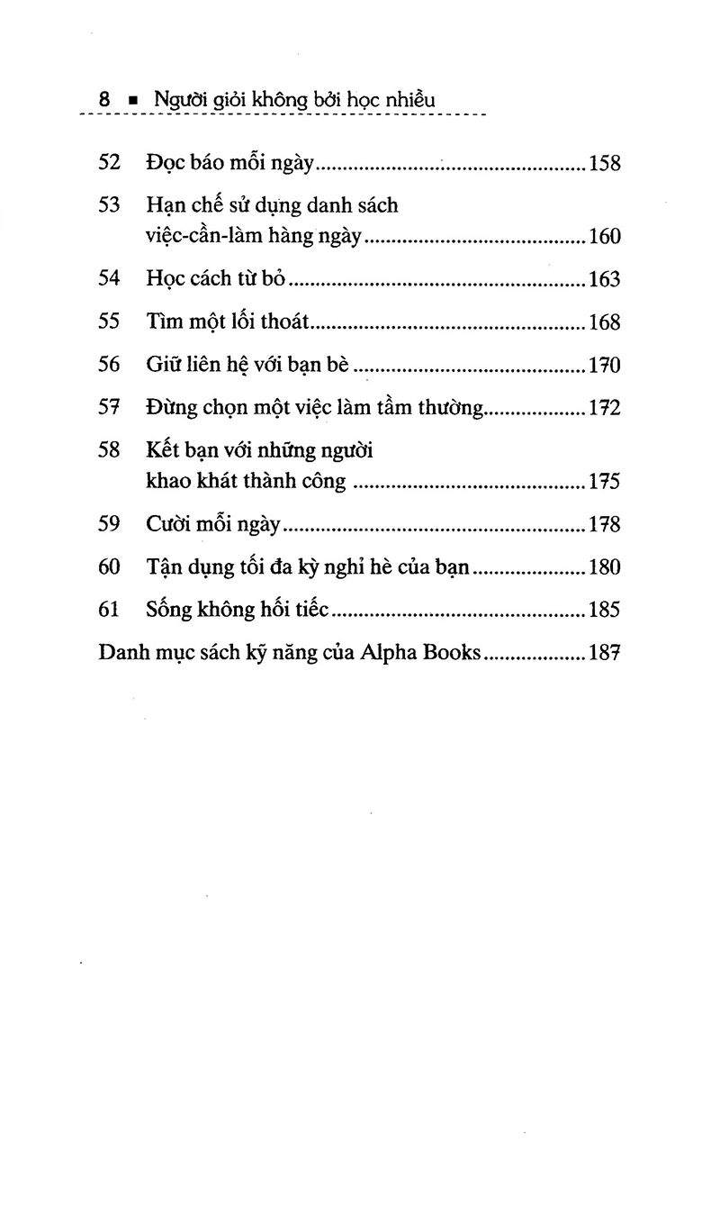 Người Giỏi Không Bởi Học Nhiều (Tái Bản 2018) Người giỏi không bởi học nhiều là cuốn sách kỹ năng sẽ giúp bạn trở thành một sinh viên nổi bật và có những năm tháng trên giảng đường đại học. Bạn làm gì để trở thành một sinh viên nổi bật? Làm thế nào để bạn có những năm tháng trên giảng đường đại học thú vị nhất, trưởng thành nhất - tốt nghiệp đại học bằng xuất sắc, tham gia các hoạt động bổ ích, và khi ra trường xây dựng được một hồ sơ xin việc đẹp, có nhiều cơ hội việc làm sau khi tốt nghiệp đại học? Cuốn sách Người giỏi không bởi học nhiều do Alpha Books biên soạn sẽ cung cấp cho bạn những phương pháp dễ áp dụng nhất trong học tập cũng như rèn luyện phong cách sống, giúp bạn đạt được những điều trên, và còn hơn thế nữa. Trong cuốn sách tư duy học tập này, bạn sẽ biết cách : Không đọc tất cả những gì được giao trên lớp Tạo ra “Nghi thức Chủ nhật” Bỏ đi một số giờ học mỗi kỳ Bắt đầu bài tập lớn ngay khi được giao Trở thành chủ tịch một câu lạc bộ trong trường Ứng tuyển mười học bổng mỗi năm Làm tốt hơn bất kỳ người nào bạn biết Và còn nhiều điều nữa… .