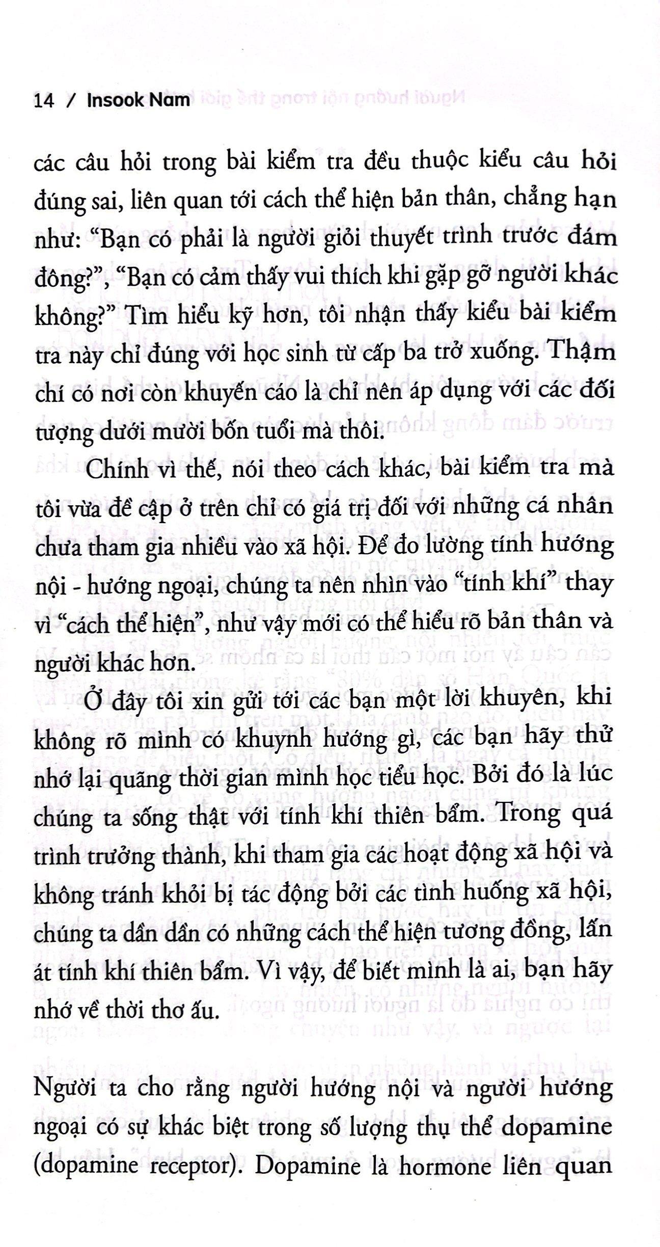 Bản thân cũng là một người hướng nội điển hình và phải chật vật tìm cách sinh tồn trong một xã hội dường như chỉ dành riêng cho người hướng ngoại, tác giả Insook Nam đã viết nên cuốn Người hướng nội trong thế giới hướng ngoại từ những trải nghiệm cá nhân và đem đến cho tất cả những người hướng nội một kim chỉ nam để có thể vừa sống là chính mình vừa đồng thời hòa hợp cùng thế giới.