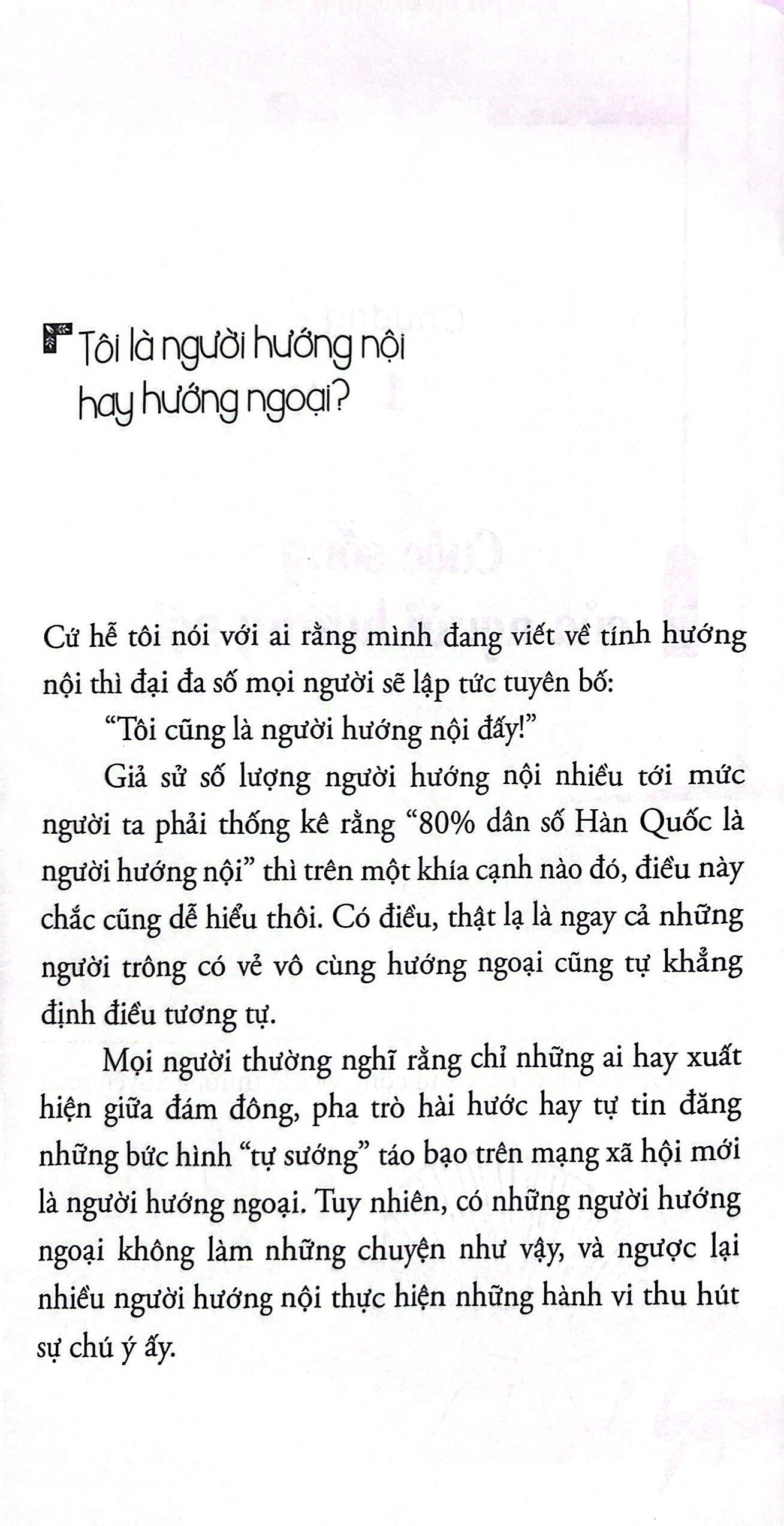 Bạn không cần phủ nhận sự nhạy cảm vốn có của bản thân, cũng chẳng cần ghen tị với những người hướng ngoại có vẻ ngoài hào nhoáng, hãy cứ giữ nguyên tốc độ, nhịp điệu và phương pháp giao tiếp của riêng mình. Có thể sẽ hơi chậm một chút, hơi vụng về một chút, hơi cô đơn một chút, thế nhưng bạn sẽ nhận ra, sống là chính mình đem lại sự tự do và niềm hạnh phúc bạn mà chưa từng mường tượng.