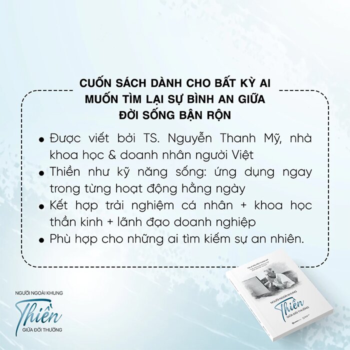 Người Ngoài Khung - Thiền Giữa Đời Thường Ở Việt Nam, khi nhắc đến thiền, nhiều người dễ liên tưởng đến các hoạt động mang tính tôn giáo. Phần lớn sách viết về thiền cũng do các bậc tu hành biên soạn, khiến công chúng khó thấy sự gần gũi vì khoảng cách giữa tác giả và người đọc vẫn còn khá xa. Từ góc nhìn của một nhà khoa học, một “doanh nông” giản dị, một người khởi nghiệp ở tuổi 60 và chọn gắn bó phần đời còn lại với nông dân quê hương, tác giả Nguyễn Thanh Mỹ sẽ cho người đọc hiểu thế nào là “thiền giữa đời thường” và “sống thiền” thực sự ra sao. Quyển sách mang đến cách tiếp cận gần gũi, lồng ghép giữa dữ liệu khoa học, chuyện đời và trải nghiệm lãnh đạo doanh nghiệp một cách chân thực, mộc mạc. Bạn đọc sẽ được lắng nghe lời tâm sự từ một người bạn vong niên giàu trải nghiệm và đầy tình thương. Thiền, không chỉ là ngồi yên và quan sát tâm trí, mà còn là khả năng “hành thiền” trong từng hành động đời thường. Một kỹ năng sống thiết yếu giữa nhịp sống hiện đại đầy biến động và bận rộn như hôm nay. CUỐN SÁCH CHỨNG MINH THIỀN LÀ MỘT LỐI SỐNG: THỰC TIỄN, SÂU SẮC VÀ DÀNH CHO TẤT CẢ MỌI NGƯỜI Thông tin tác giả Tiến sĩ Nguyễn Thanh Mỹ là Chủ tịch Hội đồng quản trị Công ty Cổ phần MyLan Group; Chủ tịch Hội đồng quản trị Công ty Cổ phần RYNAN Holdings JSC, có trụ sở tại Khu công nghiệp Long Đức, TP. Trà Vinh. Ông là một doanh nhân và nhà khoa học nổi tiếng người Việt Nam, là nhà phát minh và đồng phát minh trên 400 bằng sáng chế ở Hoa Kỳ, Canada, Trung Quốc, Việt Nam và nhiều nước khác. Ông cũng là đồng tác giả 68 bài báo cáo về hóa học vật liệu trên các tạp chí khoa học ở Hoa Kỳ, Anh và Đức. Ông đã nhiều lần tham gia các hội nghị về khoa học, khởi nghiệp, nông nghiệp thông minh trong và ngoài nước với tư cách diễn giả.