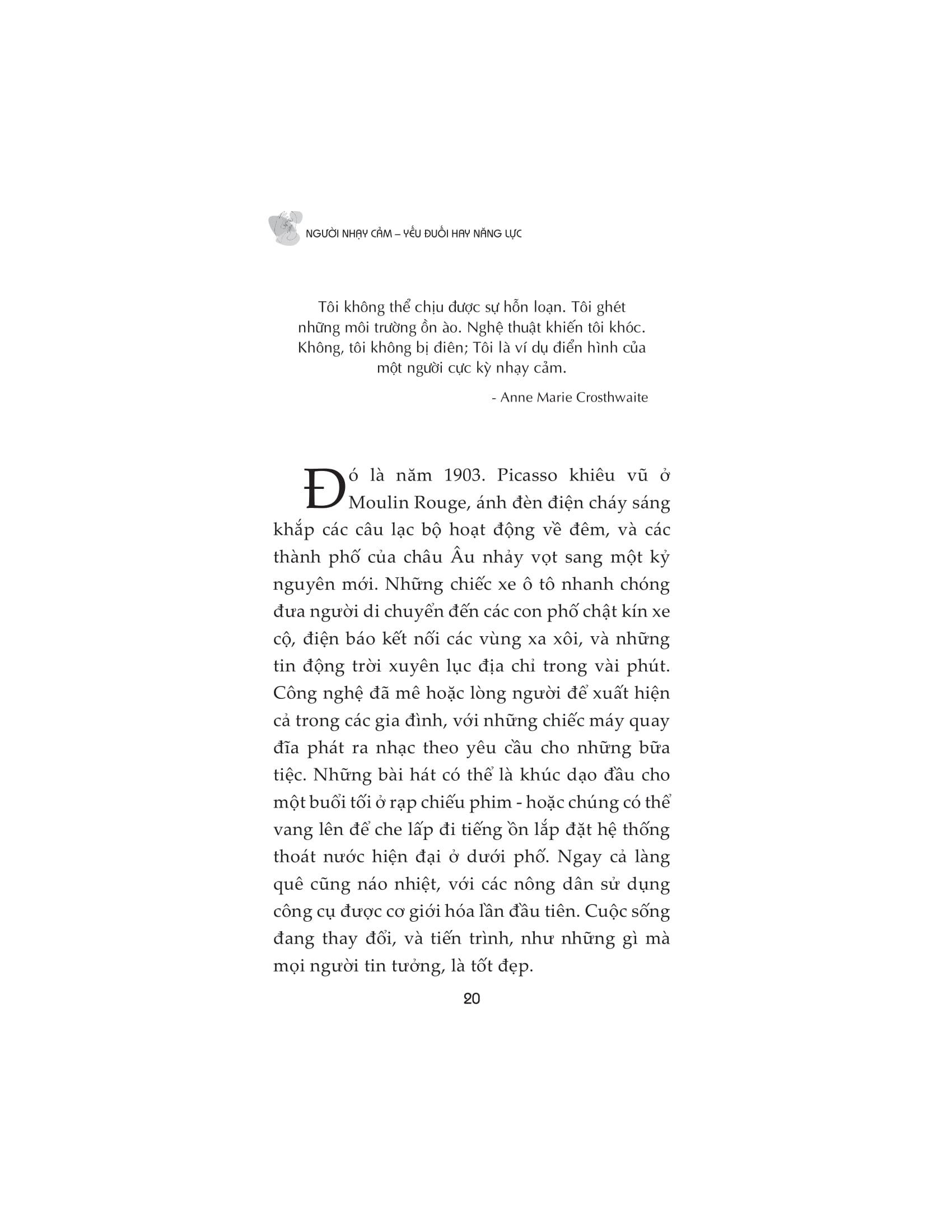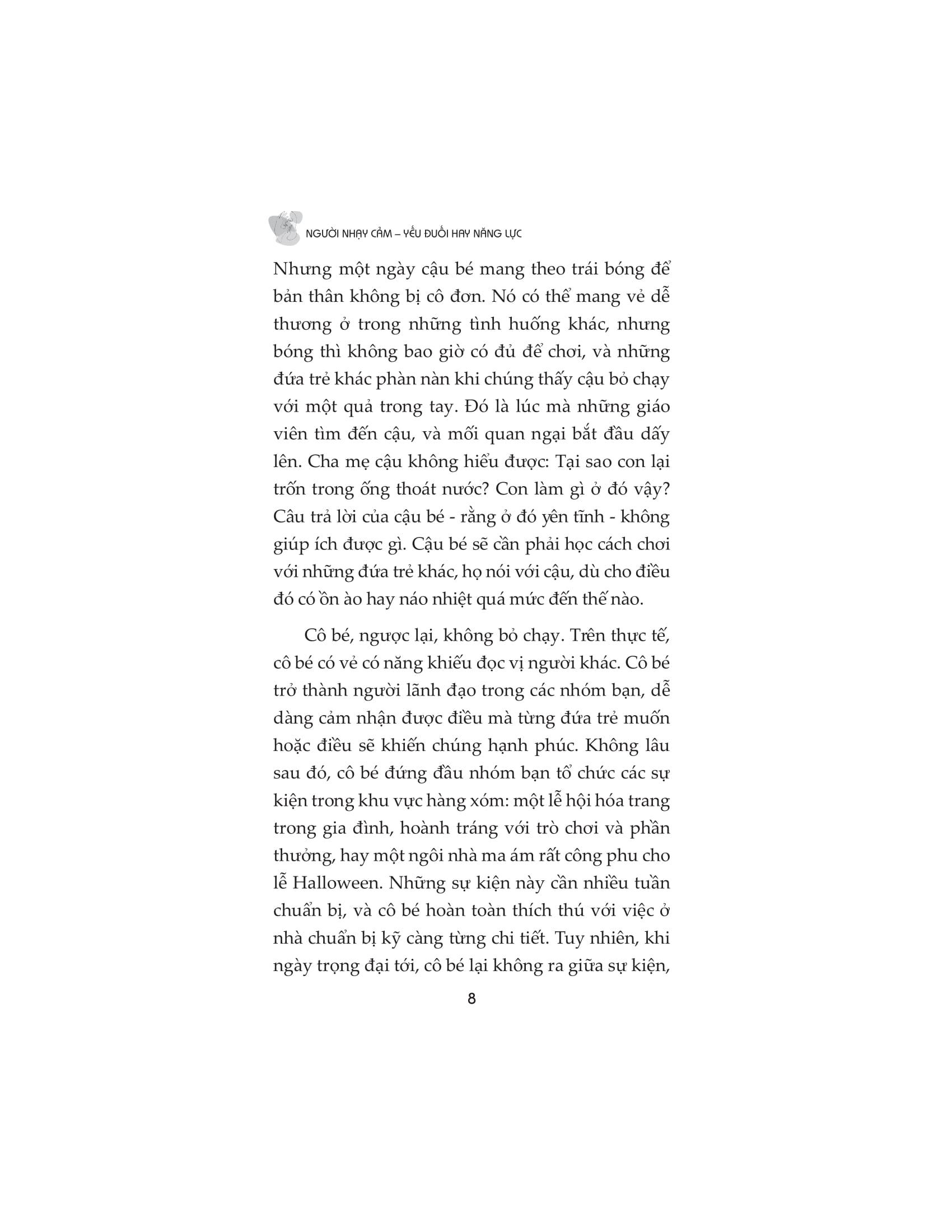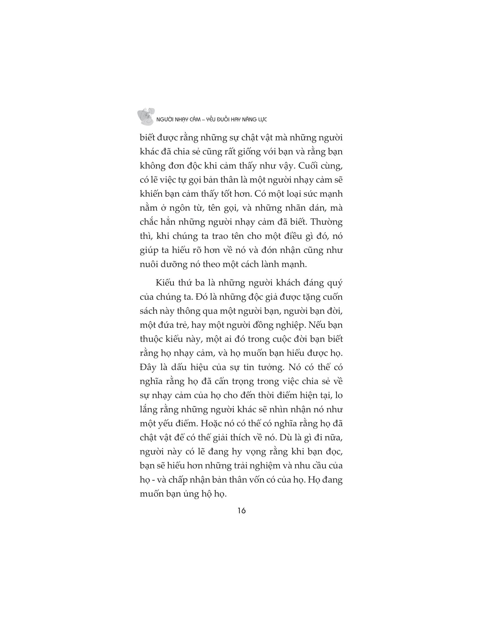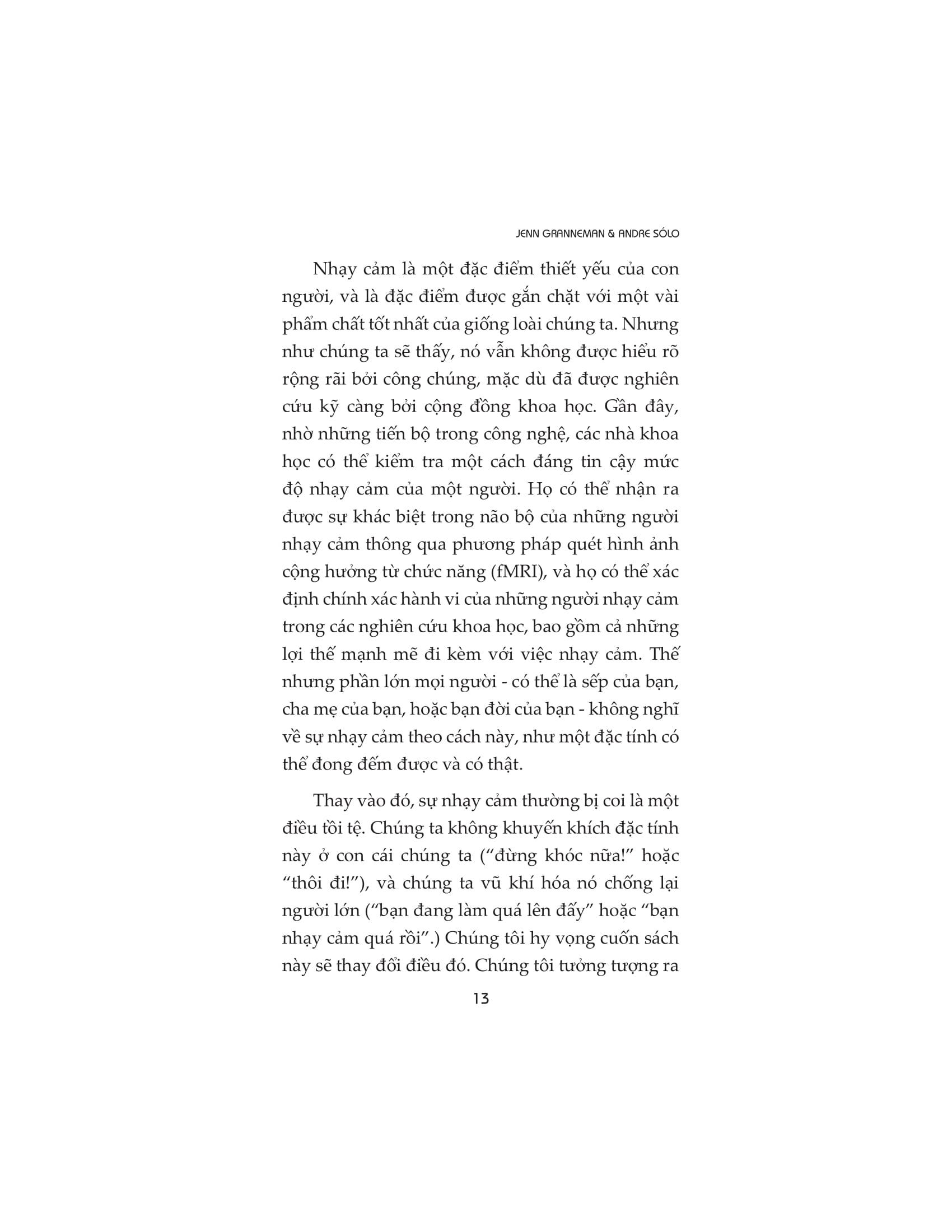 Người nhạy cảm đều có quyền lựa chọn con đường riêng của họ. Nhưng có một bước mà tất cả chúng ta đều phải thực hiện và nó là bước khó khăn nhất: ngưng nhìn nhận sự nhạy cảm là một khiếm khuyết và bắt đầu coi nó là một món quà. Cuốn sách chứa đầy cảm hứng này sẽ thay đổi mãi mãi cách chúng ta nhìn nhận những người nhạy cảm và cách họ nhìn nhận chính m.ình.
