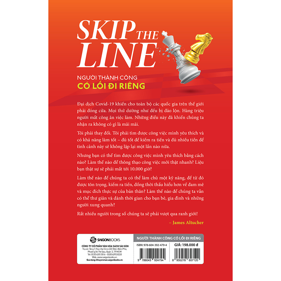 NGƯỜI THÀNH CÔNG CÓ LỐI ĐI RIÊNG Linh hoạt thay đổi là điều rất quan trọng Một đại dịch khủng khiếp đã khiến cả hành tinh hoàn toàn bị tắt ngúm. Bốn mươi triệu người lao động ở Mỹ nộp đơn xin trợ cấp thất nghiệp. Thế giới tưởng như đã đi đến đường cùng. Tình hình bắt đầu hỗn loạn. Biểu tình diễn ra ở khắp mọi nơi. Và rồi nền kinh tế mở cửa trở lại, màn sương bắt đầu mờ dần đi và hậu quả là thứ mà chúng ta có thể nhìn thấy. Nhiều doanh nghiệp phá sản. Nhiều ngành công nghiệp bị thay đổi hoàn toàn. Và nhiều người trở nên lạc lối trong thế giới mới. Các khả năng như linh hoạt thay đổi, xác định đam mê, thành thạo các kỹ năng, kiếm tiền từ điều mình yêu thích, những điều này chưa bao giờ quan trọng đến thế. Ở trường, không ai dạy chúng ta kỹ năng “vượt quyền”. Thầy cô không bao giờ nói với chúng ta rằng thế giới có thể bỗng nhiên trở nên rất đáng sợ trừ phi chúng ta biết cách sống trong vùng đất khó đoán định ấy. Quy tắc 10.000 thử nghiệm trong sách “Người thành công có lối đi riêng” Làm thế nào để có được tự do và không phải nghe lời sai bảo từ người khác? Làm thế nào để chúng ta có thể làm chủ một kỹ năng, để từ đó được đồng nghiệp tôn trọng, kiếm ra tiền, đồng thời thấu hiểu hơn về đam mê và mục đích thực sự của bản thân? Làm thế nào để chúng ta vẫn có thể thư giãn, tận hưởng thời gian với bạn bè, gia đình và những người xung quanh? Những ý tưởng trong cuốn sách “Người thành công có lối đi riêng” có thể giúp bạn bừng tỉnh. Quy tắc 10.000 thử nghiệm mà tác giả sẽ mô tả trong cuốn sách này là không được chìm đắm trong “ham muốn thất bại liên hoàn”. Trong cuốn sách này chúng ta sẽ không làm theo quy tắc 10.000 giờ – quy tắc cho rằng nếu bạn kiên trì luyện tập một kỹ năng nào đó trong 10.000 giờ, bạn sẽ trở thành một trong những người làm công việc đó giỏi nhất thế giới. Đây là cách tiếp cận những thay đổi và khủng hoảng bằng cách sử dụng các công cụ giúp tăng cường sự sáng tạo, kỹ năng thực hành, thuyết phục, lãnh đạo và hiệu suất làm việc. Tất cả những kỹ năng này khi kết hợp với nhau sẽ đưa bạn tới thành công vượt ngoài sức tưởng tượng, với tốc độ mà người khác sẽ nói là bất khả thi. Khi bạn sử dụng Quy tắc 1% và các công cụ trong cuốn sách này (ví dụ như Quy tắc tăng hiệu suất 50/1, các kỹ thuật về phép toán ý tưởng và kiểm soát tình thế), bạn sẽ nhận ra rằng bạn có lượng thời gian gần như vô hạn để làm nên những tiến bộ 1% mỗi ngày trong cuộc sống của mình. Mọi thứ trong cuốn sách SKIP THE LINE: The 10,000 Experiments Rule and Other Surprising Advice for Reaching Your Goals này đều được kết nối với nhau. Nhảy cóc không phải là các mẹo có thể áp dụng trong mọi tình huống. Nó cũng không bao gồm các lối tắt khi một tình huống nhất định. Nó là một cách sống cho phép đam mê dẫn dắt việc học hỏi, thời gian và nhiều nguồn lực khác. Bằng cách luyện tập để giỏi hơn mỗi ngày, bạn sẽ có thể làm những việc gần với sở thích và đam mê của mình nhất.
