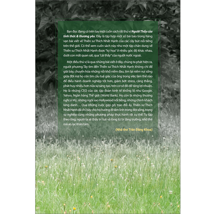 Người Thầy Của Tỉnh Thức & Thương Yêu Bạn đọc đang có trên tay một cuốn sách rất thú vị Người Thầy của tỉnh thức & thương yêu. Đây là tập hợp một số bài báo trong hàng vạn bài viết về Thiền sư Thích Nhất Hạnh của các cây bút nổi tiếng trên thế giới. Có thể xem cuốn sách này như một tập chân dung về Thiền sư Thích Nhất Hạnh được “ký họa” ở nhiều góc độ khác nhau, dưới con mắt quan sát, qua “cái thấy” của người nước ngoài. Một điều thú vị là qua những bài viết ở đây,chúng ta phát hiện ra, người phương Tây tìm đến Thiền sư Thích Nhất Hạnh không chỉ để giãi bày, chuyển hóa những nỗi khổ niềm đau, tìm lại niềm vui sống giữa đời mà họ còn tìm cầu tuệ giác của ông trong việc làm thế nào để điều hành doanh nghiệp tốt hơn, giảm bớt stress, căng thẳng, phát huy nhiều hơn nữa sự sáng tạo, trên cơ sở đó để tăng lợi nhuận. Họ là những CEO của các tập đoàn kinh tế khổng lồ như Google, Yahoo, Ngân hàng Thế giới (World Bank). Họ còn là những thượng nghị sĩ Mỹ, những ngôi sao Hollywood nổi tiếng, những chính khách lừng danh… Qua những cuộc gặp gỡ, trao đổi ấy, Thiền sư Thích Nhất Hạnh đã chỉ bày cho họ hướng đi tâm linh trong đời sống, trong sự nghiệp cùng những phương pháp thực hành rất cụ thể. Tu tập theo ông, người ta sẽ thấy trí tuệ và lòng từ bi tăng trưởng, nhờ thế mà an lạc thân tâm - NHÀ THƠ TRẦN ĐĂNG KHOA Tôi đã gặp một vị Thầy đúng nghĩa trên nhiều phương diện, thâm sâu và chứng đạt, chú trọng cả tu tập lẫn xây dựng tăng thân, thấm nhuần vừa giáo pháp truyền thống vừa biết rõ hướng đi của thế giới ngày nay - MELVIN MCLEOD Trong chiếc áo tràng nâu truyền thống của người xuất gia, Thiền sư Thích Nhất Hạnh nói bằng giọng nhỏ nhẹ, dễ hiểu với một thứ tiếng Anh rất chuẩn, thỉnh thoảng có pha chút âm tiếng Pháp. Ngôn ngữ và cách nói năng của Thầy rất thư thái, như những giọt nước mát dịu rót vào tai và vào tâm thức của người nghe. Hầu như mọi điều về Thầy Nhất Hạnh đều được đánh dấu bằng sự định tĩnh, một sự mát mẻ nhẹ nhàng vượt khỏi sự tĩnh lặng thông thường - TREVOR CAROLAN Chủ tịch Ngân hàng thế giới Jim Yong Kim đã mời Thầy tới trụ sở của tổ chức này tại Washington để hướng dẫn một ngày chánh niệm cho các nhân viên của ông. Cuốn sách yêu thích nhất của ông Kim là cuốn Phép lạ của sự tỉnh thức mà Thầy là tác giả. Ông Kim đã ca ngợi sự thực tập của Thầy – vị thiền sư “có sự cảm thông và lòng từ bi sâu sắc đối với những người đau khổ”. - JO CONFINO
