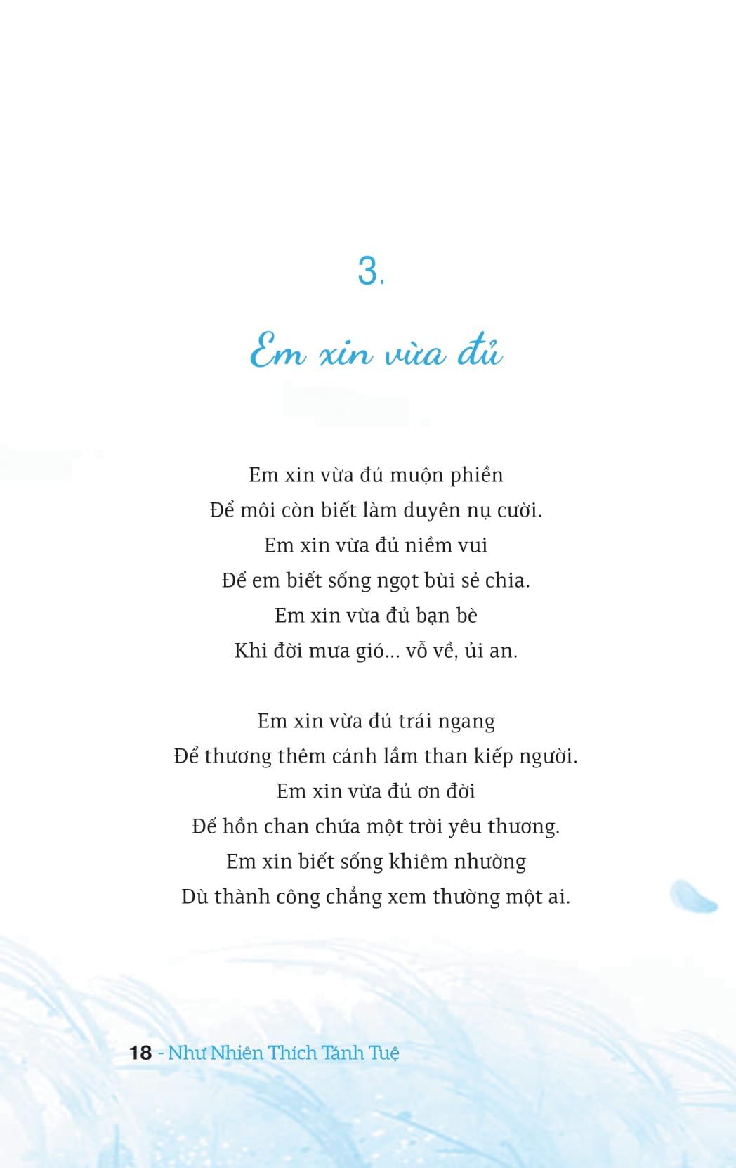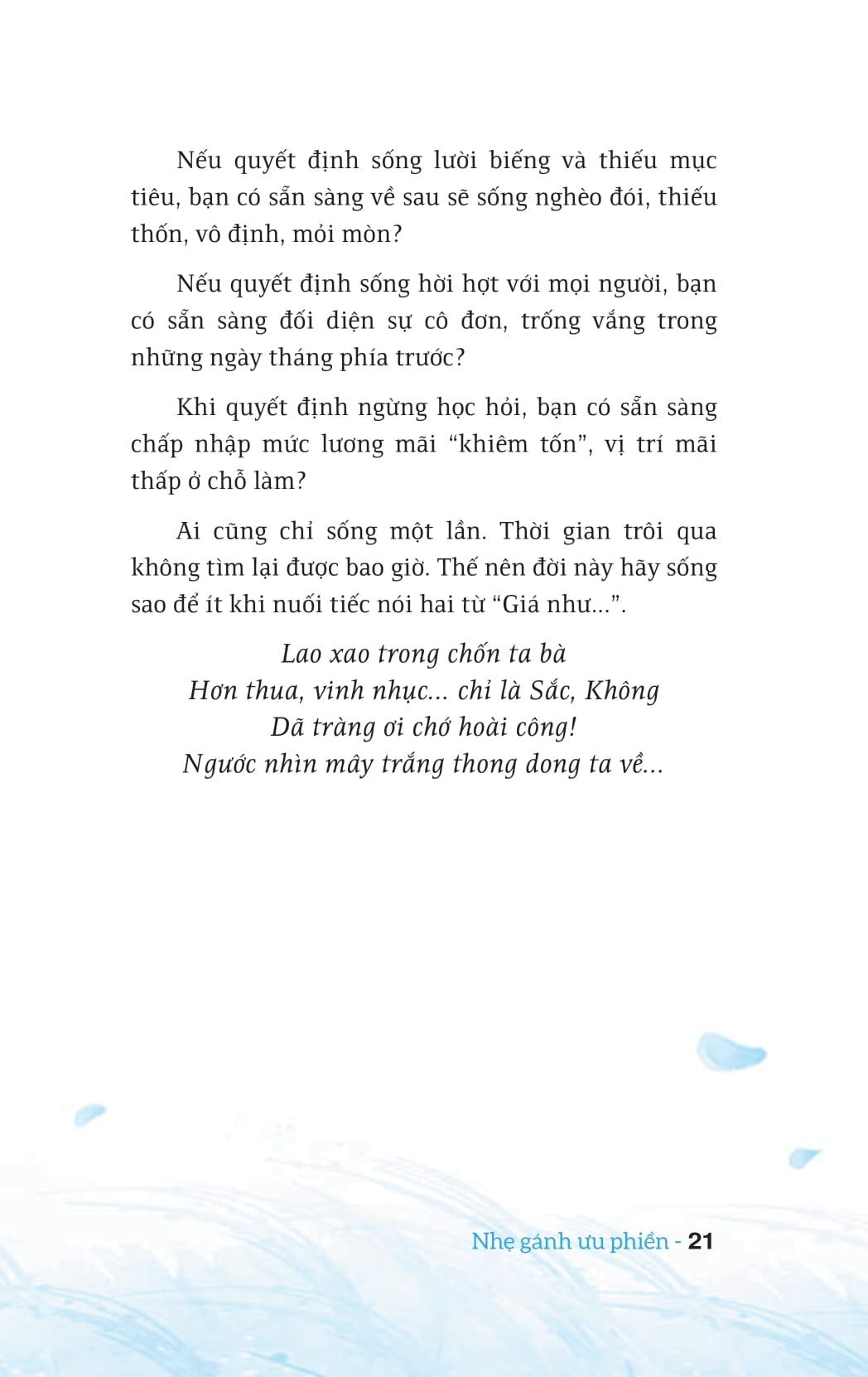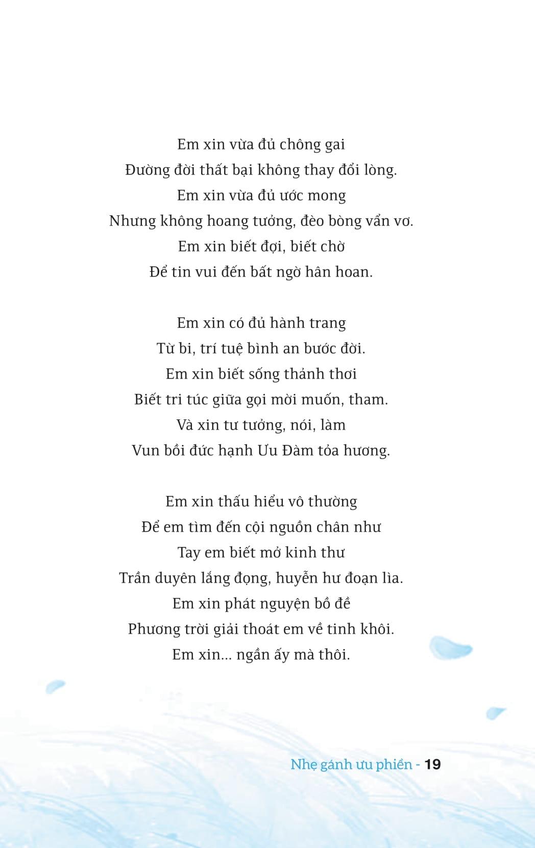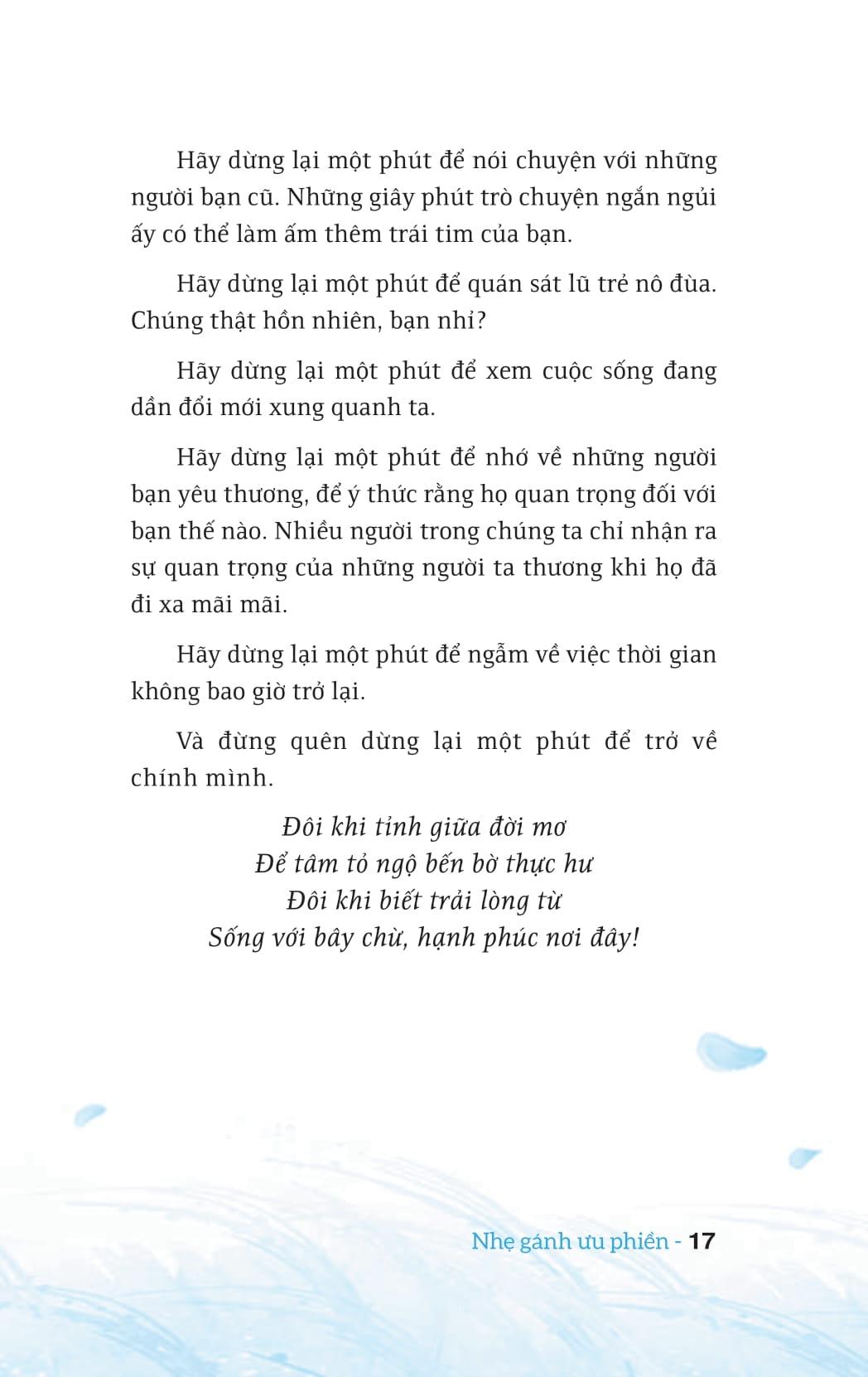 Nhẹ Gánh Ưu Phiền Nhẹ gánh ưu phiền là quyển sách thứ hai của tác giả Như Nhiên Thích Tánh Tuệ sau An nhiên giữa những thăng trầm. Với mong muốn tiếp tục góp thêm một đầu sách giúp quý độc giả vơi nhẹ gánh ưu phiền, tận hưởng niềm hạnh phúc, an lạc ngay trong từng hơi thở, tác giả tiếp tục tập hợp các bài văn, bài thơ vào cuốn sách thứ hai này nhằm truyền tải thông điệp chính: hạnh phúc không ở đâu xa xôi, hạnh phúc đang ở đây, ngay lúc này. Điều quan trọng là đôi mắt bạn có nhìn ra, trái tim bạn có cảm nhận được những niềm hạnh phúc ấy không. Đó cũng chính là giá trị và lợi ích thiết thực của sự tu tập trong Phật giáo. Tu không phải để ngày mai ngày kia sẽ hạnh phúc mà tu lúc nào là hạnh phúc ngay lúc đó. Tu là hạnh phúc bây giờ Không ăn bánh vẽ, không chờ kiếp sau! Sách còn truyền cảm hứng sống một cuộc đời ý nghĩa, ngát hương thiện lương. Sâu thẳm trong lòng mỗi người, có lẽ ai cũng biết rõ rằng sẽ có ngày m.ình phải rời xa cuộc đời và sự chết có thể xảy ra bất cứ lúc nào. Giá trị một đời người không phải là sống dài lâu mà nằm ở chỗ người ấy đã làm được những điều gì tốt cho bản thân và cuộc đời. Đời người mong manh và vô cùng đáng quý, thế nên sao ta không dốc tâm làm ngay những việc tốt đẹp? Đức Phật khuyên nhắc chúng ta nên gấp rút làm nhiều việc tốt, việc thiện để hướng thiện cho bản thân và làm cho cuộc đời chung thêm phần an lạc. Sự thiện lương và bình an trong nội tâm của bạn sẽ góp phần tạo nên sự bình an của thế giới bên ngoài. Và sự bình an chung ấy sẽ ảnh hưởng đến nhiều người khác quanh bạn. Thế nên, ngay giây phút này, bạn hãy dám sống như một bông hoa, hồn nhiên nở, hết lòng dâng hiến vẻ đẹp và hương thơm cho đời.