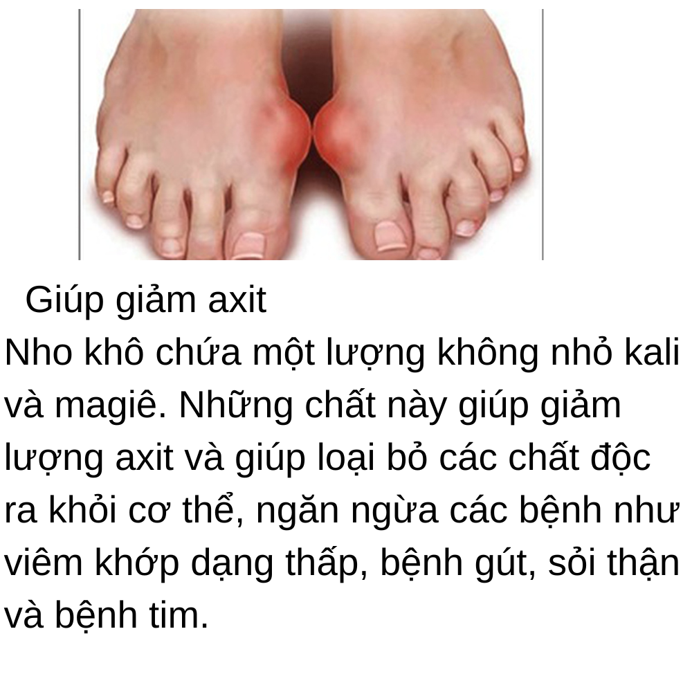 ️ Nho khô mang lại nhiều ích lợi cho não bộ, giảm stress, có lợi cho tim mạch, hệ kháng thể và nhất là chống lão hóa - kéo dài tuổi thanh xuân, loại bỏ cholesterol có hại cho cơ thể tăng lượng hồng cầu trong máu, loại bỏ các cholesterol có hại, bổ sung canxi, giảm độc tố cho cơ thể,...