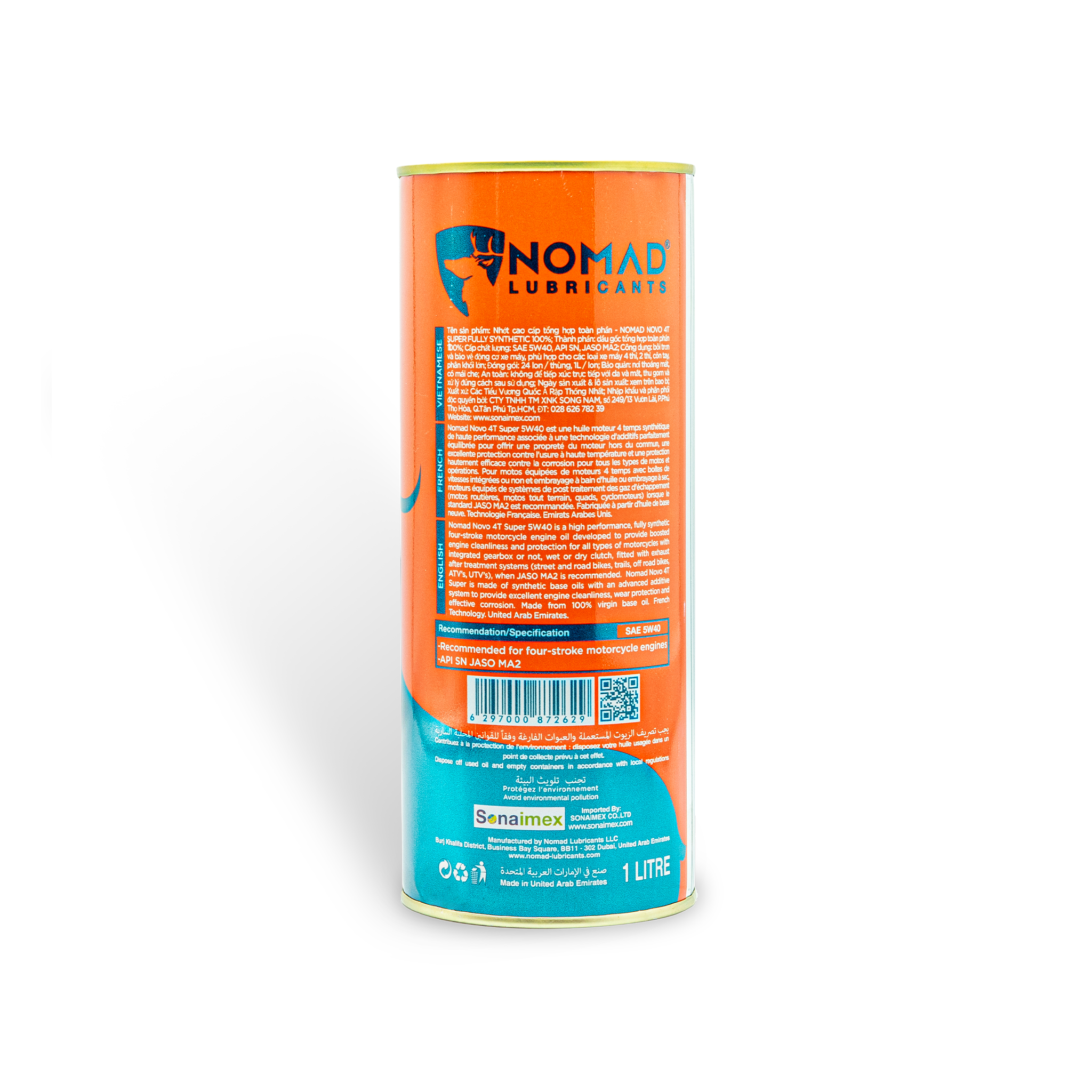 - Thu gom và xử lý đúng cách sau sử dụng để bảo vệ môi trường. Không vứt bao bì, không đổ dầu nhớt xuống đất, nguồn nước VỀ THƯƠNG HIỆU DẦU NHỚT NOMAD LUBRICANTS Nomad Lubricants được thành lập năm 1998 tại xứ sở dầu mỏ khổng lồ Dubai. Ban đầu, Nomad chỉ tập trung vào một số dòng sản phẩm dầu nhớt chuyên biệt, dầu thủy lực và nước làm mát động cơ. Đến năm 2005, công ty bắt đầu mở rộng hoạt động sản xuất qua dầu nhớt vận tải, công nghiệp và hàng hải. Năm 2010, công ty mở rộng gấp đôi diện tích và công suất sản xuất. Năm 2015, công ty đầu tư dây chuyền công nghệ hiện đại từ Pháp, cho ra đời nhiều sản phẩm dầu nhớt tổng hợp toàn phần chất lượng cao, đáp ứng hoàn hảo các tiêu chuẩn quốc tế về dầu nhờn. Năm 2017, Nomad hợp tác cùng Công Ty TNHH TM Xuất Nhập Khẩu Song Nam (Sonaimex) bắt đầu phân phối thương hiệu Nomad tại thị trường Việt Nam. Công nghệ sản xuất hiện đại của Nomad kết hợp sự thấu hiểu thị hiếu người tiêu dùng nội địa của Sonaimex đã cho ra mắt dòng nhớt tổng hợp toàn phần cao cấp chuyên biệt cho các dòng xe tay côn, dung tích đặc biệt 1.1L và 1.3L chính thức đầu tiên tại Việt Nam. Sự thành công của sản phẩm giúp thương hiệu Nomad có tiếng vang trong phân khúc khách hàng hướng đến và được người tiêu dùng yêu mến lựa chọn. Công nghệ hàng đầu Châu Âu cộng với trụ sở ngay tại xứ sở dầu mỏ, NOMAD LUBRICANTS sở hữu lợi thế về sản phẩm chất lượng cao nhưng giá thành cạnh tranh. Danh mục sản phẩm của NOMAD rất đa dạng, từ dầu nhớt dành cho xe máy, xe ô tô, vận tải, tàu thuyền, máy móc công nghiệp nặng – nhẹ, đến các dòng phụ gia và bảo dưỡng chăm sóc động cơ. VÌ SAO NÊN CHỌN NHỚT NOMAD