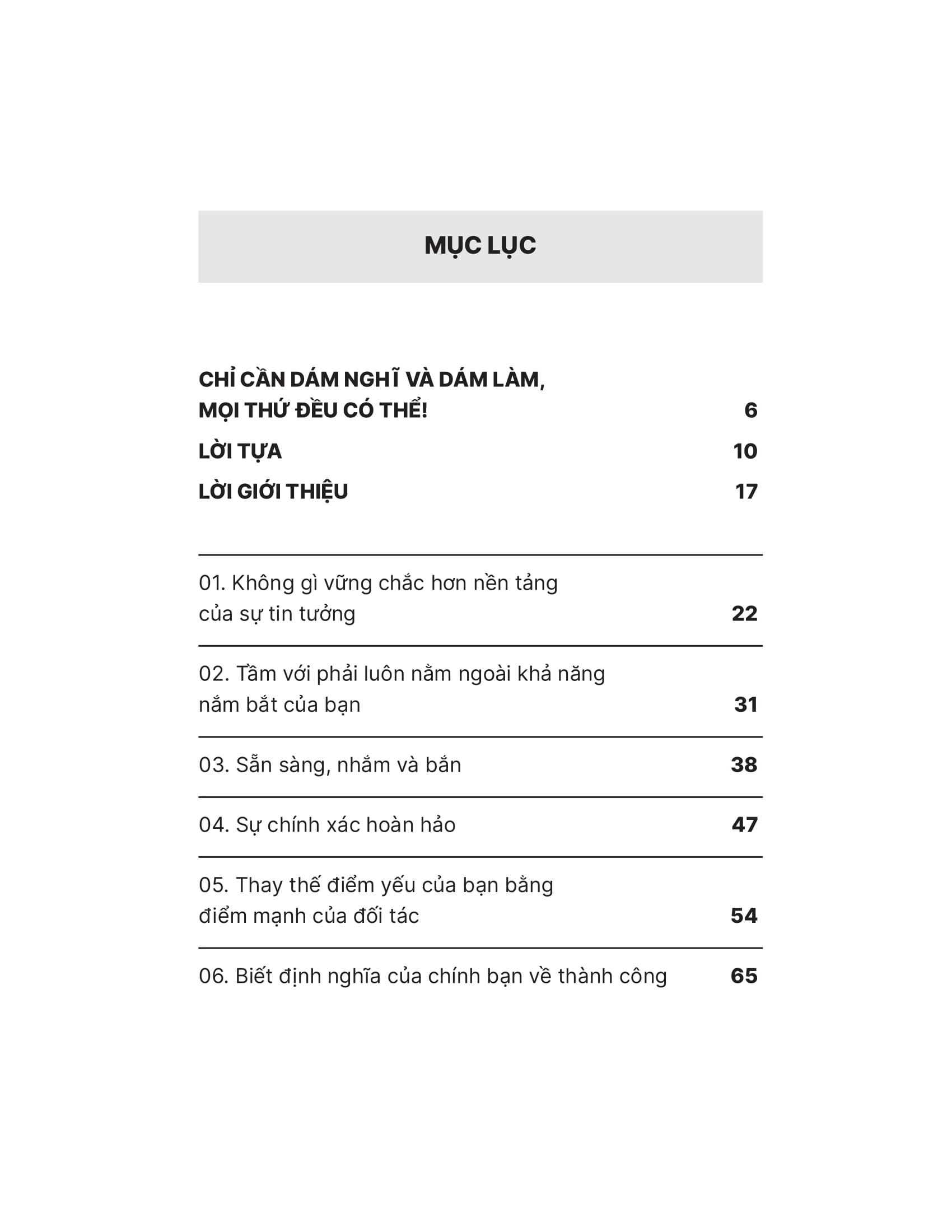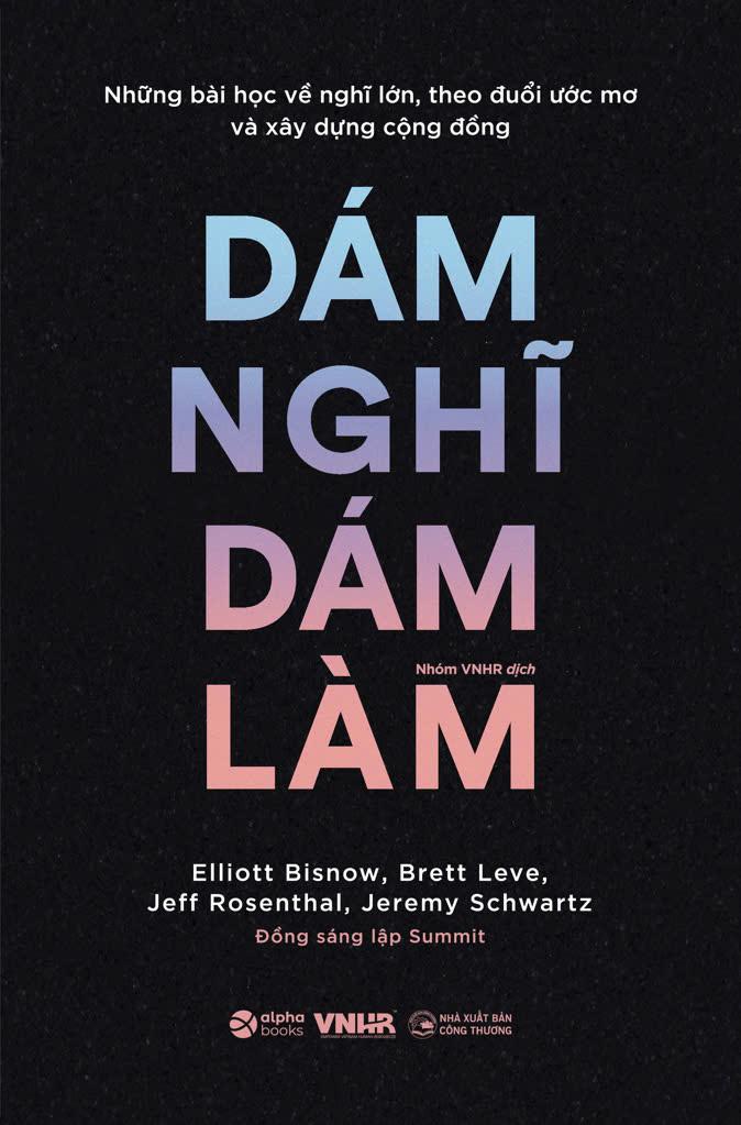 - Bất kỳ ai muốn đạt được mục tiêu lớn: Dù bạn đang làm việc trong lĩnh vực nào, cuốn sách này đều có thể cung cấp cho bạn những động lực và cảm hứng để đạt được những thành công vượt trội. II. TÓM TẮT SÁCH Năm 2008, bốn chàng trai trẻ tuổi, chưa có nhiều kinh nghiệm Elliott Bisnow, Brett Leve, Jeff Rosenthal và Jeremy Schwartz làm quen với nhau và bắt đầu tổ chức một sự kiện quy tụ những nhà khởi nghiệp trẻ triển vọng nhất nước Mỹ lúc bấy giờ. Trải qua nhiều thách thức và nhiều lời từ chối cũng như khó khăn về tài chính - như bất cứ công ty mới khởi nghiệp nào, họ đã phát triển Summit thành một cộng đồng toàn cầu với các sự kiện trên khắp thế giới, với sự tham gia của nhiều nhân vật nổi tiếng bao gồm Jeff Bezos, Richard Branson, Sam Altman (CEO OpenAI), Tony Hsieh (CEO quá cố của Zappos), Evan Williams (đồng sáng lập Twitter), Garrett Camp (đồng sáng lập Uber), Jessica Alba (diễn viên)... Năm 2013, các nhà sáng lập Summit đã mua lại Powder Mountain, khu nghỉ dưỡng trượt tuyết lớn nhất nước Mỹ với ước mơ xây dựng một thị trấn trên đỉnh núi của tương lai. Trong Dám nghĩ dám làm, các tác giả tiết lộ những chiến thắng, sai lầm và bài học từ hành trình của mình, bắt đầu trong thời kỳ Đại suy thoái và tiếp tục cho đến ngày nay. Cùng với những bài học từ một số doanh nhân truyền cảm hứng nhất lúc bấy giờ, các tác giả cung cấp những ý chính quan trọng: • Bất cứ ý tưởng nào đều nên được nói ra. • Mua danh ba vạn, bán danh ba đồng. • Không có đường tắt dẫn đến thành công. • Xây dựng mối quan hệ là điều quan trọng nhất. Dám nghĩ dám làm cho thấy bất kỳ ai cũng có thể nghĩ lớn và - với khát khao kiến thức, một đội ngũ tài năng và một chút khiêm tốn - đạt được điều không thể. III. CUỐN SÁCH CÓ GÌ ĐẶC BIỆT