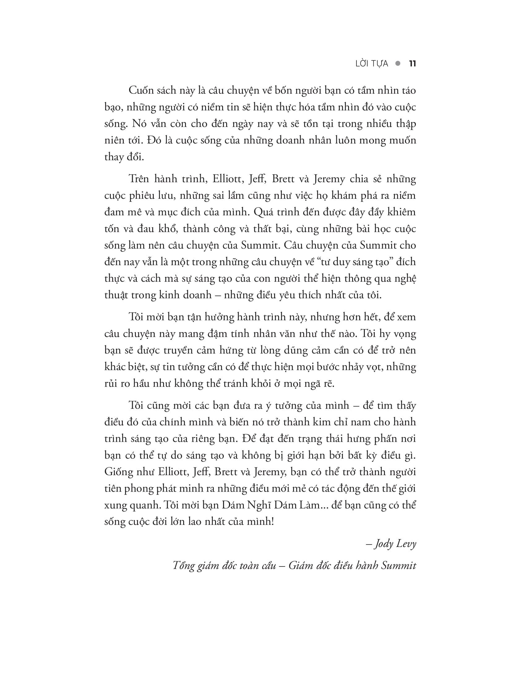 - Phong cách viết cuốn hút: Ngôn ngữ trong sách dễ hiểu, gần gũi, dí dỏm giúp độc giả thấy thoải mái và hứng thú. IV. GIỚI THIỆU TÁC GIẢ: Elliott Bisnow, Brett Leve, Jeff Rosenthal, Jeremy Schwartz Bốn tác giả cũng là đồng sáng lập Summit - cộng đồng những nhà sáng tạo và lãnh đạo tài năng trên khắp thế giới. Summit hiện đang là một trong những sự kiện có quy mô lớn nhất và ảnh hưởng nhất trên thế giới. Những người từng tham gia các sự kiện của Summit có thể kể đến như: Jeff Bezos, Richard Branson, Quincy Jones, Ted Turner, Sam Altman, Tony Hsieh, Evan Williams, Garrett Camp, Jessica Alba... V. CÁC TRÍCH ĐOẠN HAY