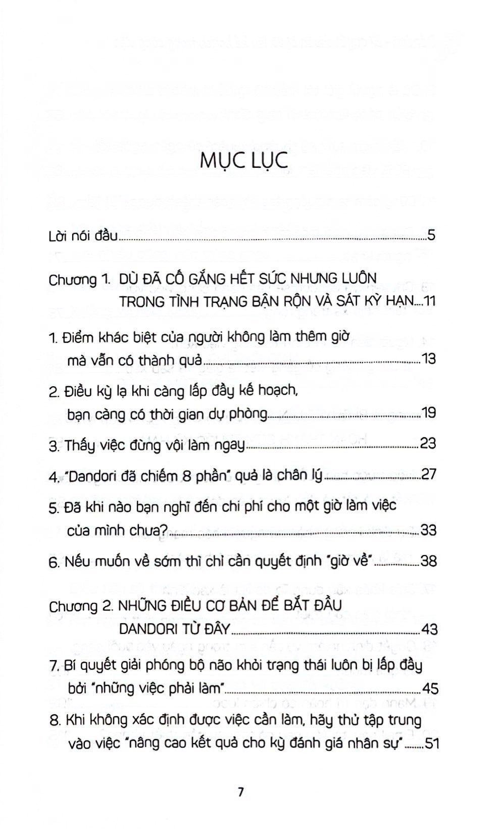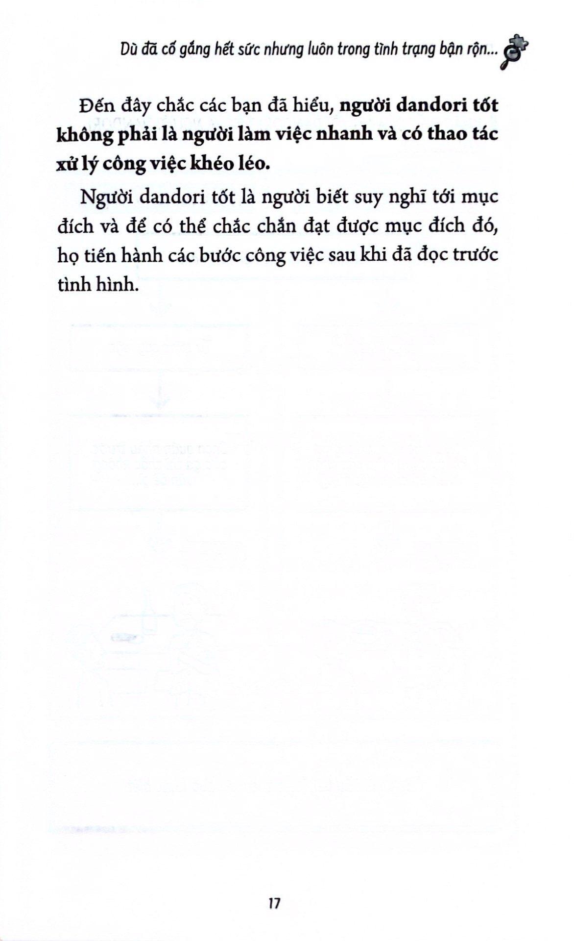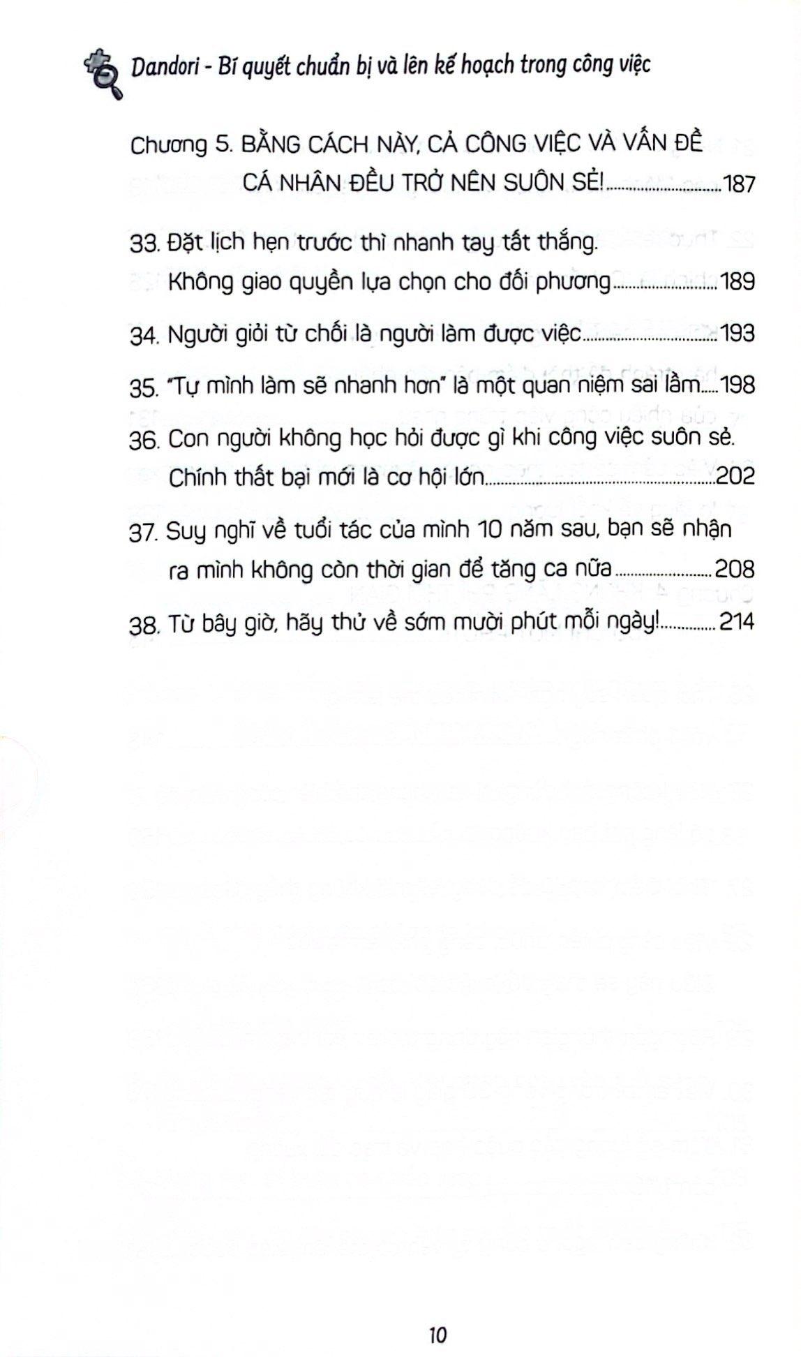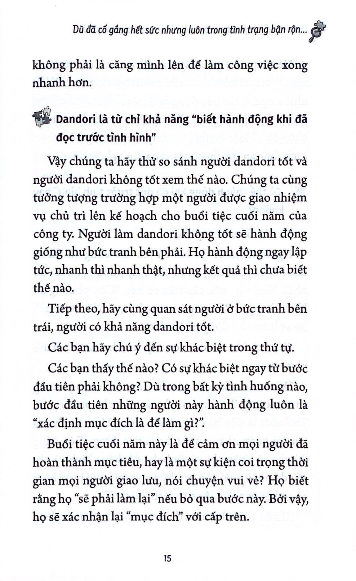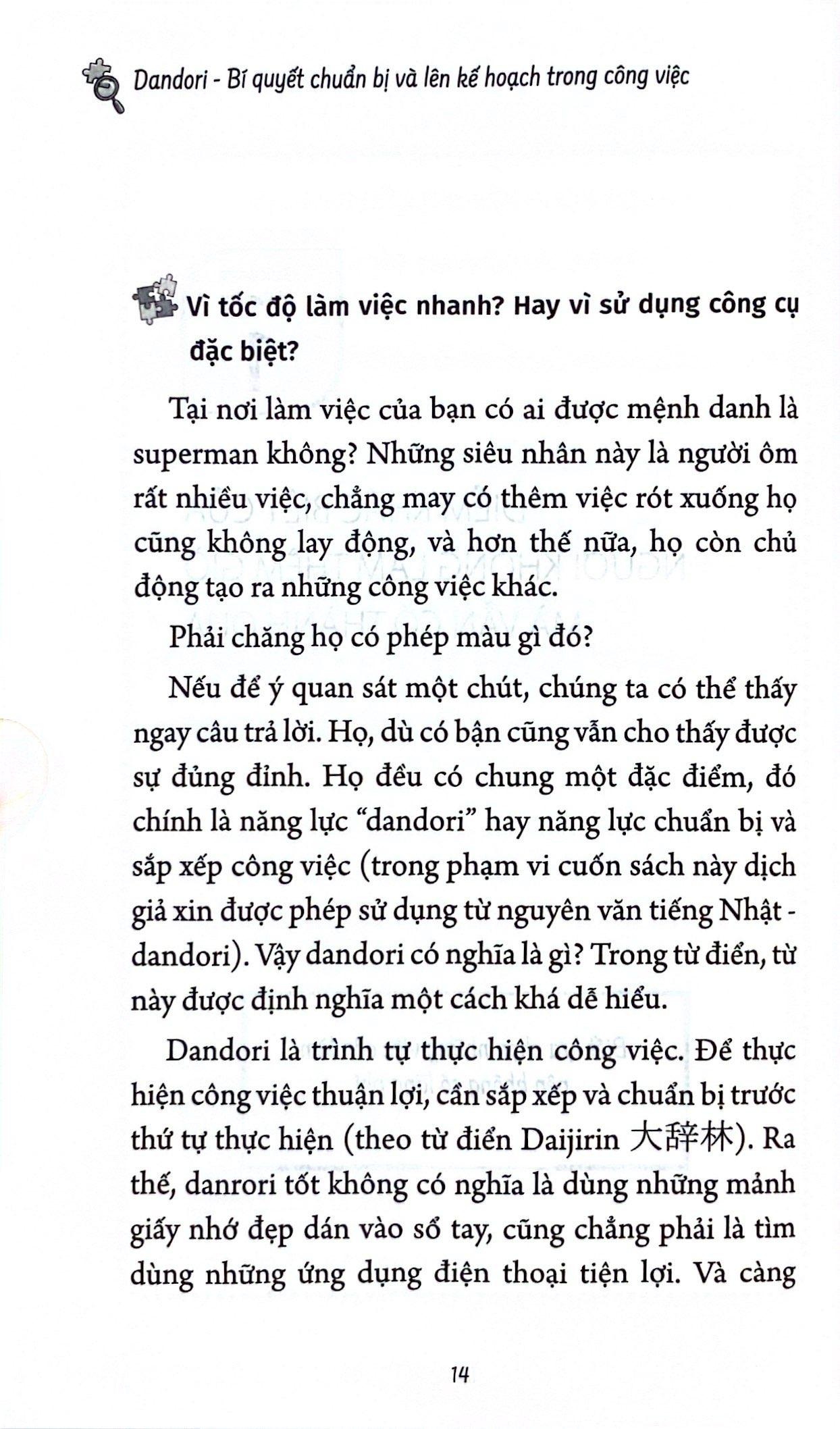 Ở Nhật, Dandori đã trở thành một từ phổ biến, người ta thường nghe “người này Dandori tốt” “người kia Dandori kém”. Vậy Dandori là gì? Có thể hiểu Dandori là năng lực chuẩn bị và sắp xếp công việc. Người có khả năng Dandori tốt không phải là người xử lý công việc nhanh, có thao tác khéo léo mà là người biết mục đích thực sự của việc m.ình sẽ làm và để đạt được mục đích đó phải lập kế hoạch chi tiết cũng theo nhiều phương án cụ thể, để dù có xảy ra bất cứ tình huống nào mục tiêu vẫn được thực hiện.