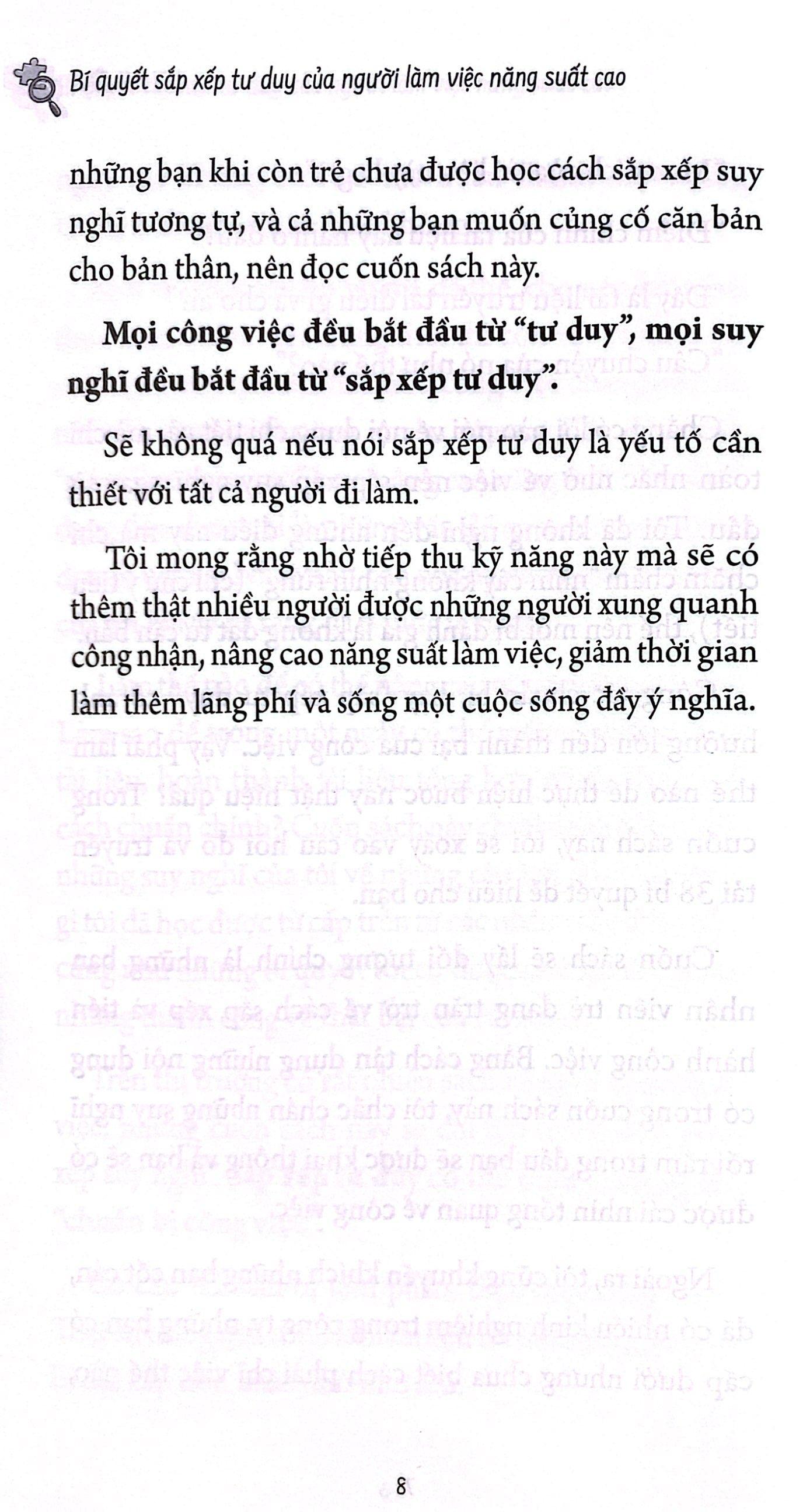 Bằng việc trang bị cho m.ình kiến thức và kinh nghiệm sắp xếp tư duy, chúng ta có thể cắt giảm thời gian "đầu óc bị rối ren", nhờ đó tăng hiệu suất làm việc. Kết quả của việc rèn luyện cho m.ình "phương pháp sắp xếp đầu óc" sẽ giúp số lượng công việc phải làm đi làm lại giảm dần, đánh giá của công ty đối với bản thân cũng được tăng lên. Từ đó giúp bạn không còn phải quẩn quanh phải làm thêm "lãng phí", có thời gian dành cho bản thân nhiều hơn với các thú vui, cho cuộc sống riêng tư, và hài lòng với công việc, cuộc sống của m.ình.