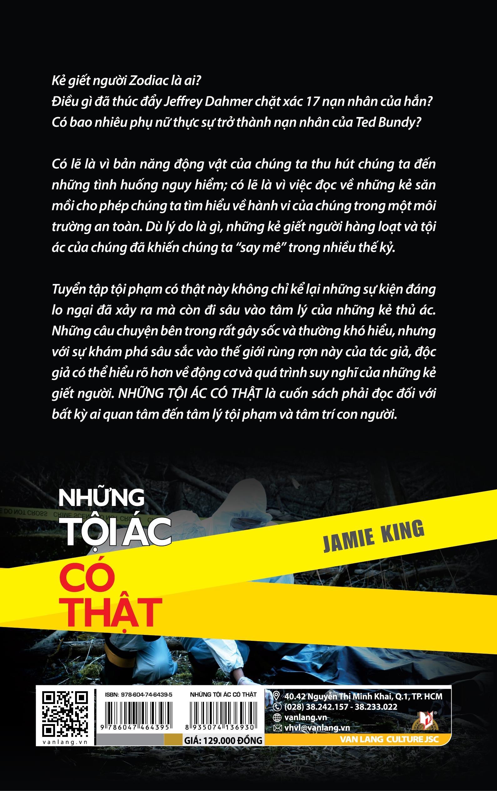 "Kẻ giết người Zodiac là ai? Điều gì đã thúc đẩy Jeffrey Dahmer chặt xác 17 nạn nhân của hắn? Có bao nhiêu phụ nữ thực sự trở thành nạn nhân của Ted Bundy? Có lẽ là vì bản năng động vật của chúng ta thu hút chúng ta đến những tình huống nguy hiểm; có lẽ là vì việc đọc về những kẻ săn mồi cho phép chúng ta tìm hiểu về hành vi của chúng trong một môi trường an toàn. Dù lý do là gì, những kẻ giết người hàng loạt và tội ác của chúng đã khiến chúng ta “say mê” trong nhiều thế kỷ. Tuyển tập tội phạm có thật này không chỉ kể lại những sự kiện đáng lo ngại đã xảy ra mà còn đi sâu vào tâm lý của những kẻ thủ ác. Những câu chuyện bên trong rất gây sốc và thường khó hiểu, nhưng với sự khám phá sâu sắc vào thế giới rùng rợn này của tác giả, độc giả có thể hiểu rõ hơn về động cơ và quá trình suy nghĩ của những kẻ giết người. NHỮNG TỘI ÁC CÓ THẬT là cuốn sách phải đọc đối với bất kỳ ai quan tâm đến tâm lý tội phạm và tâm trí con người."