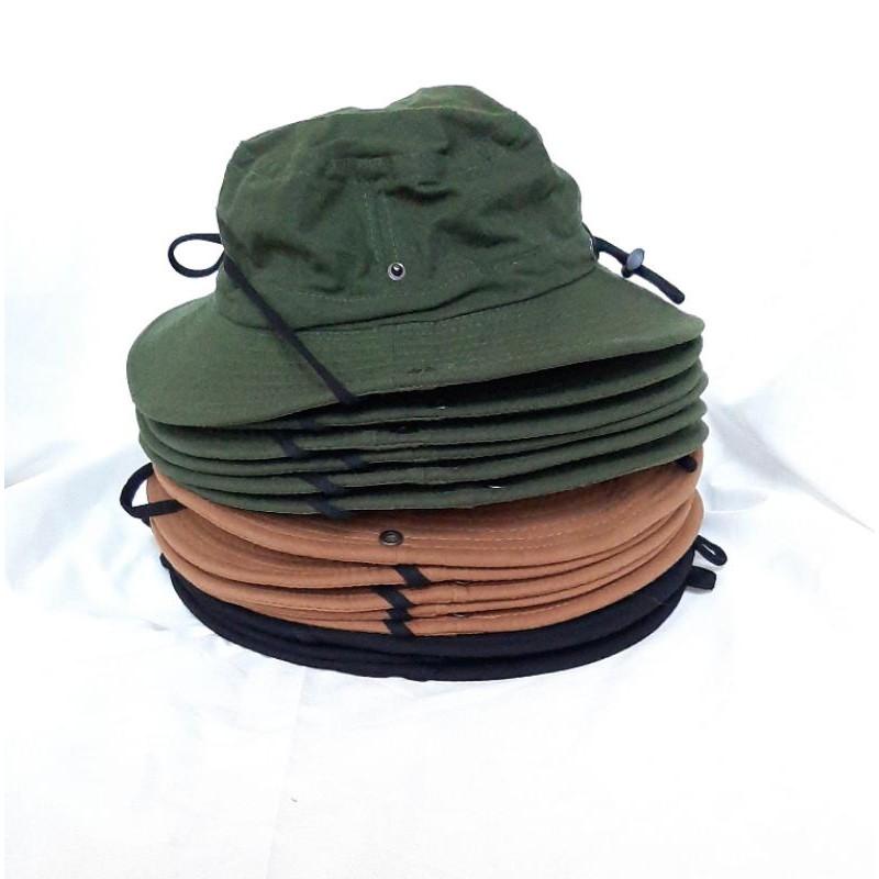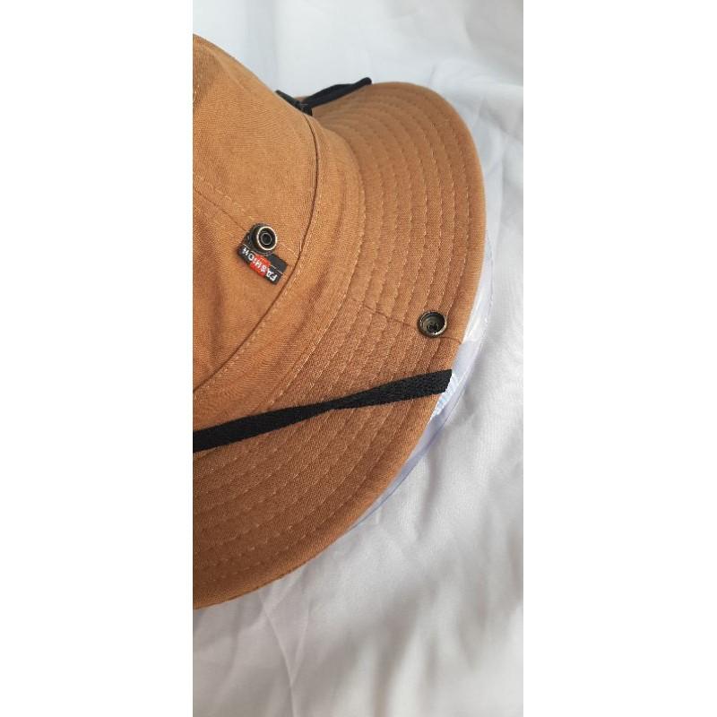 Vải Kaki dày dặn nhưng không nóng vì là 100%cotton. Có dây đeo không lo gió bay. Nút bấm kim loại 2 bên vành nón để bẻ lên cho ngầu luôn. Shop nhận thêu logo