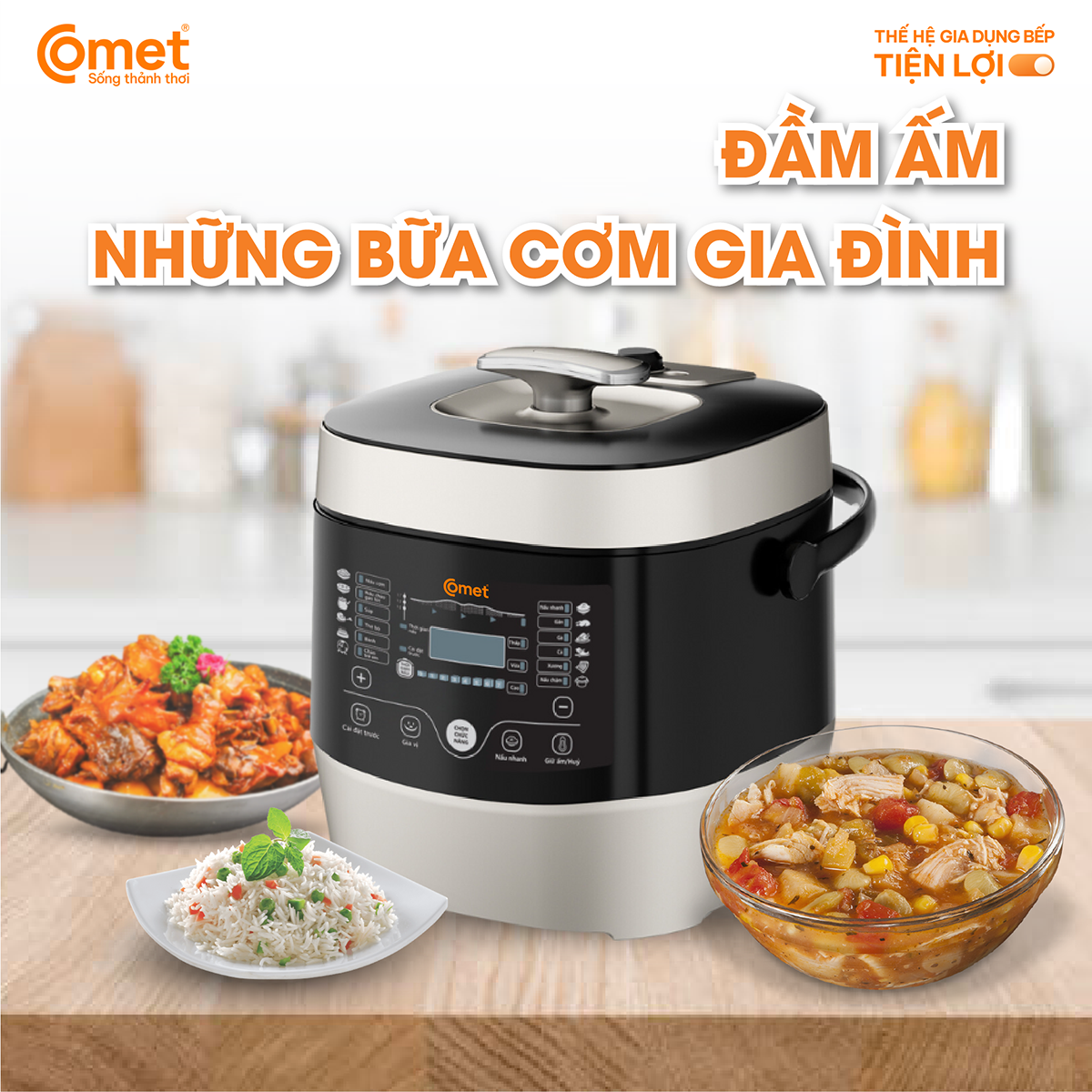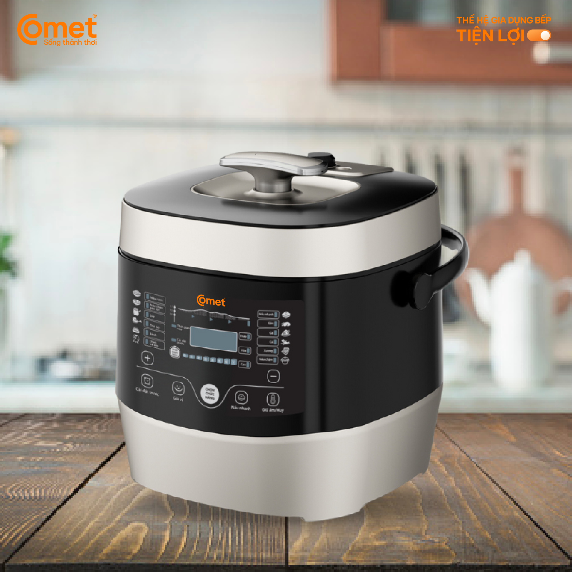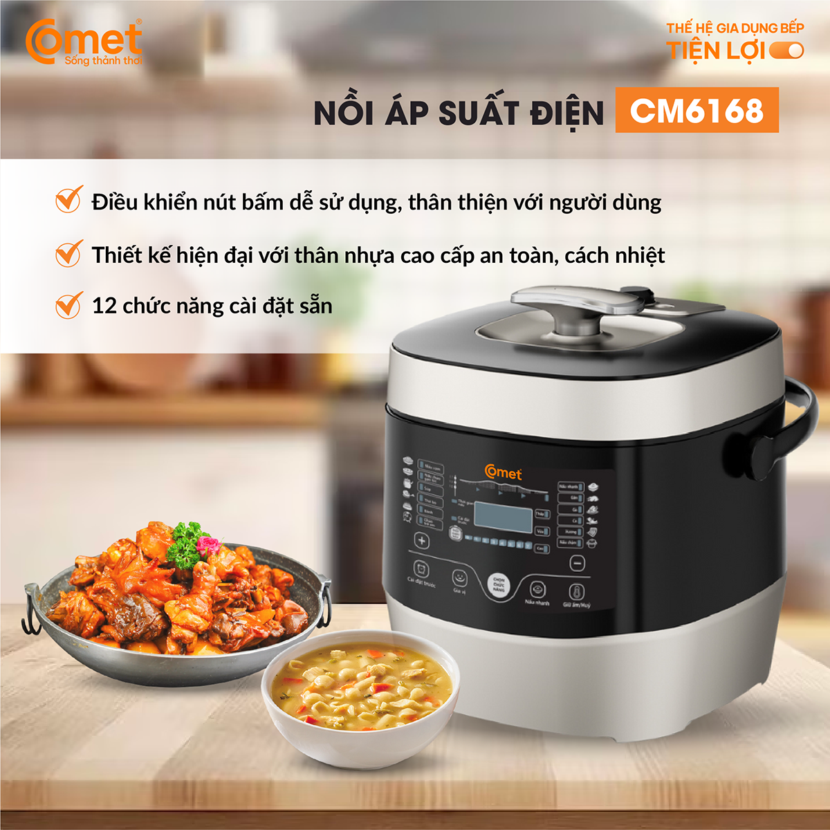 - Nồi áp suất điện tử Comet CM6168 là thiết bị nhà bếp hiện đại, đa chức năng, giúp công việc nấu ăn trở nên nhanh chóng, tiện lợi và tiết kiệm thời gian hơn cho người nội trợ. Với thiết kế sang trọng, nhỏ gọn, gam màu đen xám tinh tế cùng quai xách chắc chắn, sản phẩm phù hợp với nhiều không gian bếp hiện đại.