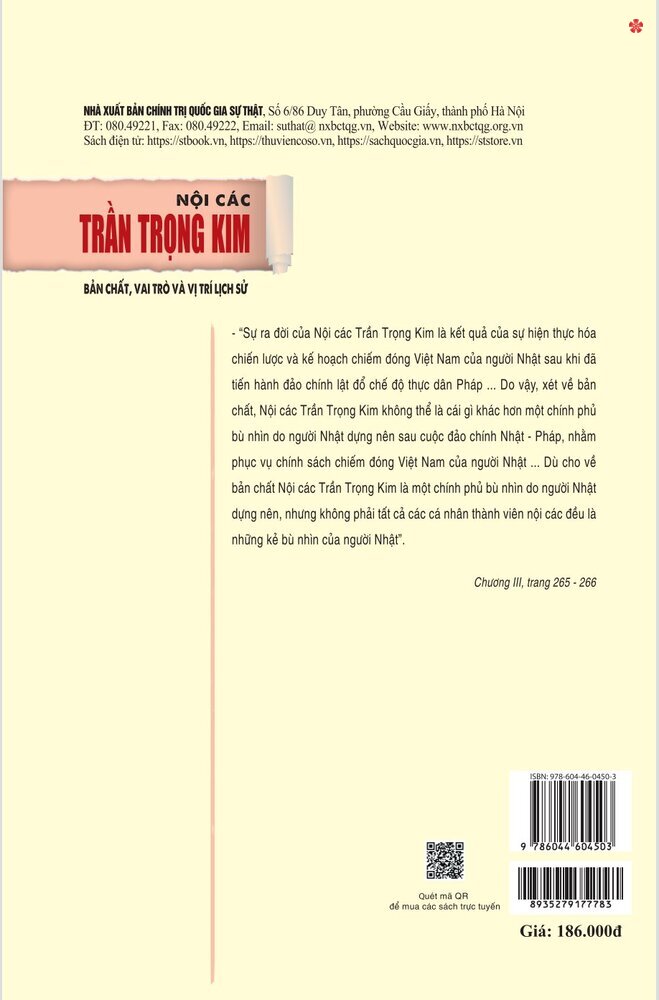 Cuốn sách: Nội các Trần Trọng Kim - Bản chất, vai trò và vị trí lịch sử của GS.TS. Phạm Hồng Tung. Trong những lần xuất bản trước, cuốn sách đã được đông đảo bạn đọc, đặc biệt là các nhà nghiên cứu lịch sử hoan nghênh.