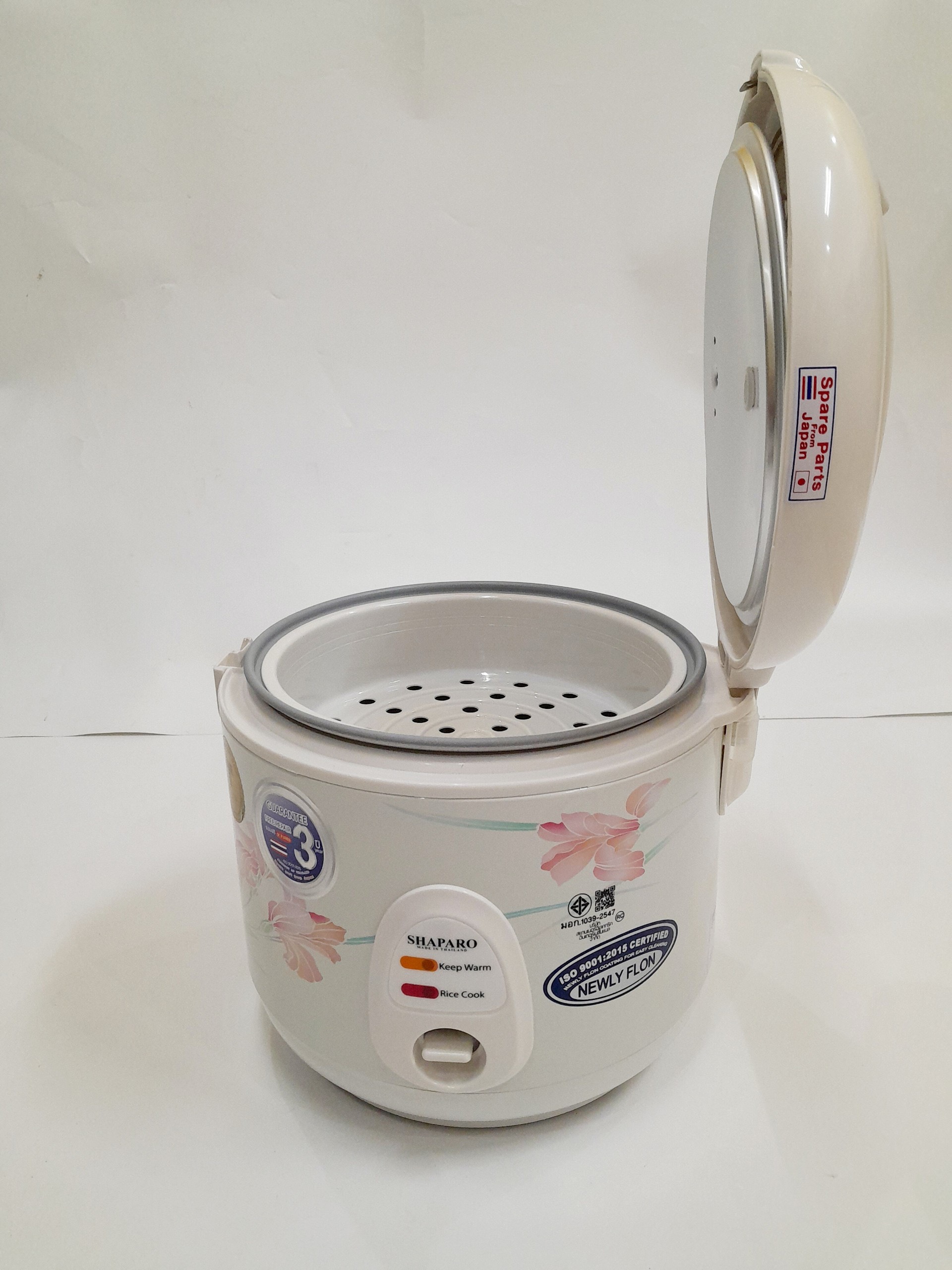 - Nồi cơm điện hiệu Shaparo Lồng nồi tráng men chống dính Vỏ nồi thiết kế hoa văn sang trọng Dung tích 1.8L Màu sắc: trắng Thùng 4 cái Linh kiện của Nhật Bản * Sản xuất tại Thái Lan