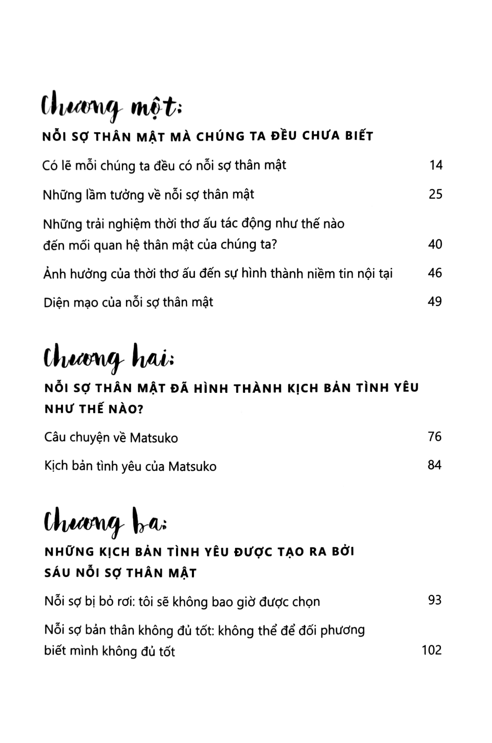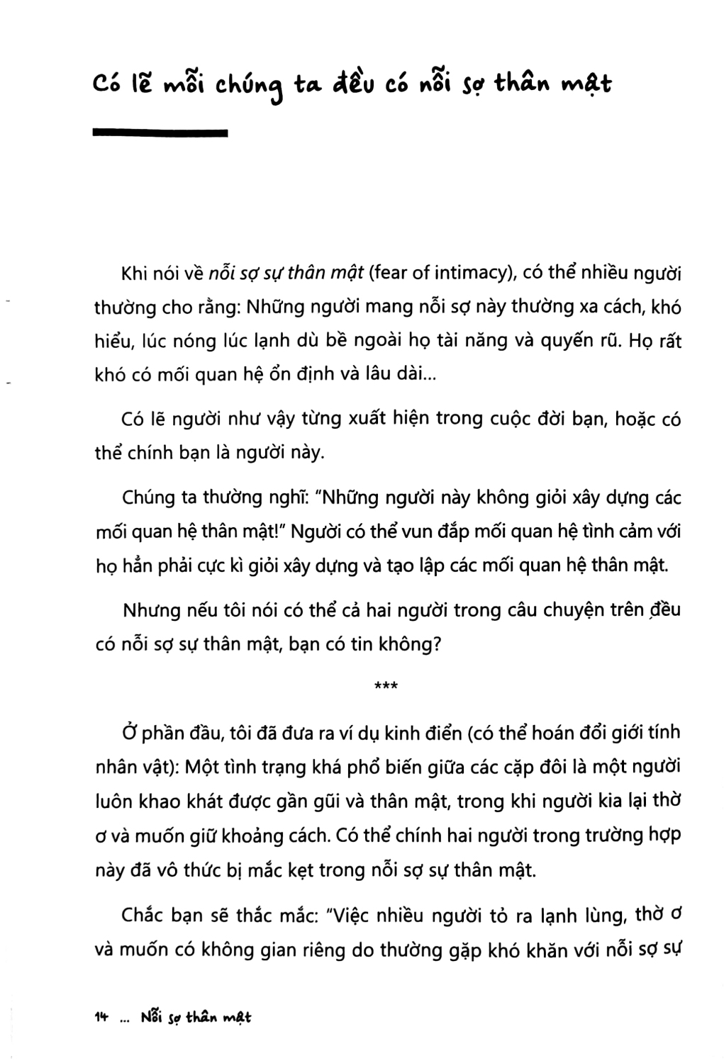 Nỗi Sợ Thân Mật Tại sao chúng ta không thể yêu và được yêu một cách hạnh phúc? Vì chúng ta đều đang bị “sa lầy” trong nỗi sợ thân mật của mình. Nỗi sợ thân mật (fear of intimacy) là một chứng sợ xã hội và rối loạn lo âu dẫn đến khó hình thành mối quan hệ gần gũi với người khác. Những người sợ hãi hoặc trốn tránh tình yêu đều có nỗi sợ sự thân mật; nhưng những người luôn làm hài lòng mọi người và khao khát được gần gũi lại càng sợ sự thân mật hơn. Vậy làm thế nào để thoát khỏi “vũng lầy” đó và xây dựng một mối quan hệ tốt đẹp? Câu trả lời nằm trong Nỗi sợ thân mật. Cuốn sách là lời thức tỉnh nhẹ nhàng giúp độc giả tự nhận thức và thấu hiểu bản thân. Hy vọng chúng ta đều có thể đưa ra những lựa chọn mới trong các mối quan hệ thân mật bởi chúng ta đều xứng đáng được hạnh phúc.