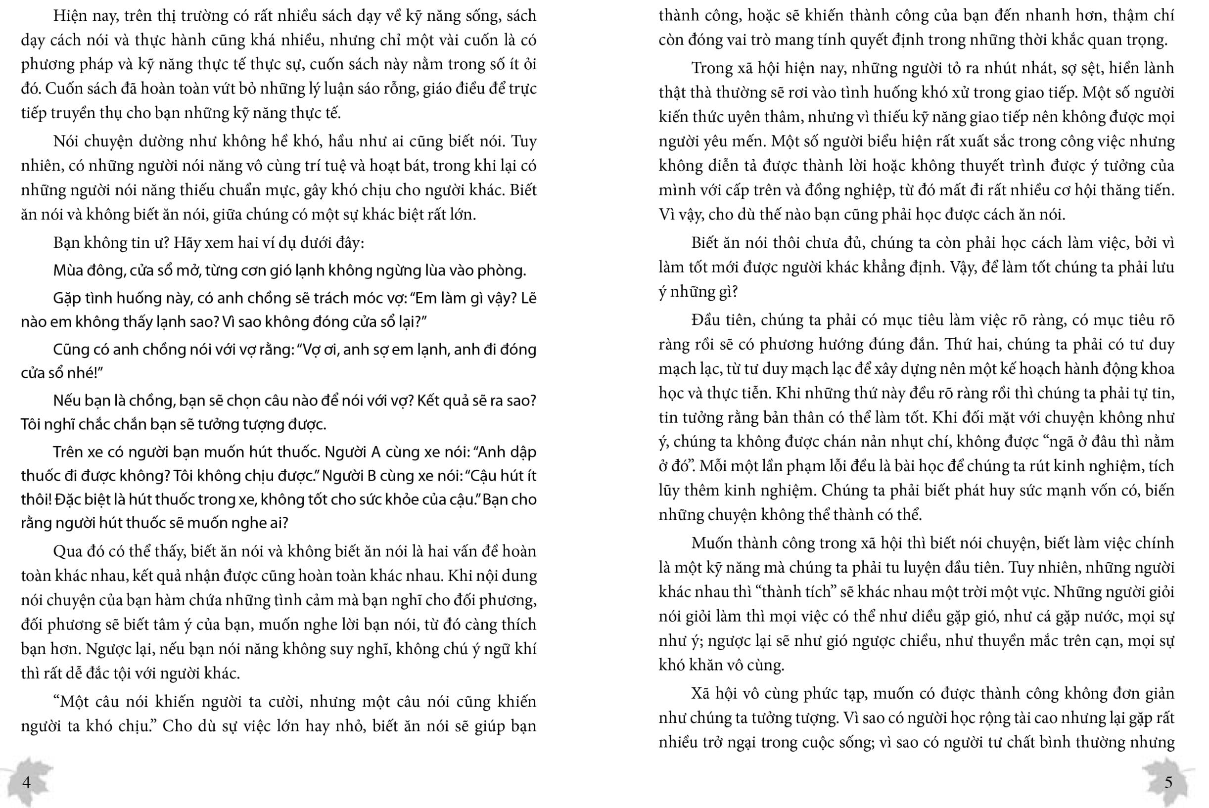 Nói Thế Nào Để Được Chào Đón, Làm Thế Nào Để Được Ghi Nhận (Tái Bản 2018) Kỹ năng giao tiếp chính là chìa khóa của thành công và hạnh phúc. Một số người có tài ăn nói bẩm sinh, họ có thể dùng sức mạnh ngôn từ để thuyết phục người khác. Nhưng nếu bạn thuộc vào phần còn lại thì cũng đừng lo lắng, vì kỹ năng giao tiếp là việc có thể rèn luyện được. Vậy làm thế nào để giao tiếp thành công? Cuốn sách “Nói thế nào để được chào đón, làm thế nào để được ghi nhận” sẽ mang đến cho bạn câu trả lời. Hiểu tâm lý của đối phương khi nói chuyện Muốn nắm bắt tâm lý của người khác, trước mắt bạn cần là người biết quan sát và lắng nghe, nhưng quan sát không được quá lộ liễu, lắng nghe phải tinh tế. Ngôn ngữ và hành động cơ thể của một người khi nói chuyện sẽ cho bạn biết tính cách cũng như hành vi của họ. “Nói thế nào để được chào đón, làm thế nào để được ghi nhận” đưa ra những hành vi tâm lý cơ bản nhất giúp bạn đọc được tâm người đối diện. Hiểu được tâm lý của người khác, từ đó điều chỉnh cách ứng xử của m.ình cho phù hợp, với những người khác nhau, bạn cần áp dụng những kỹ năng nói chuyện khác nhau, đối phương chắc chắn sẽ bị thu hút vào những câu chuyện của bạn hơn. Rèn luyện tài ăn nói để không làm người khác thấy khó chịu Xã hội hiện nay đề cao kỹ năng làm việc nhóm, tức là phối kết hợp kiến thức, năng lực của nhiều người để cùng giải quyết vấn đề. Như vậy, việc bất đồng quan điểm hay dẫn đến tranh luận là không thể tránh khỏi. Tuy nhiên, làm thế nào để những buổi thảo luận nhóm không mang lại cảm giác khó chịu, thậm chí là tâm lý phản kháng? Tài ăn nói sẽ giúp cho ích cho bạn. Đương nhiên, thỉnh thoảng bạn cũng sẽ nảy sinh cảm xúc tiêu cực không thể tránh được, nhưng bạn cần kịp thời điều chỉnh, ngăn chặn những ý nghĩ xấu, cho dù gặp chuyện không vui cũng nhất định phải cư xử thật đúng mực, đừng luôn cho m.ình là đúng, hãy đặt bản thân vào vị trí của người khác, chắn chắn tầm nhìn của bản thân sẽ cởi mở hơn nhiều. Trong sách Nói thế nào để được chào đón, làm thế nào để được ghi nhận chỉ ra một nguyên lý gọi là “Nguyên lý qua lại”, tức là khi bạn đối xử với người khác như thế nào, thì đối phương sẽ đáp trả bạn bằng chính tình cảm đó: tín nhiệm thì sẽ được tín nhiệm, hoài nghi thì sẽ bị hoài nghi, yêu thì sẽ được yêu, Áp dụng nguyên lý này trong giao tiếp, hãy đối xử thật ý nhị với người đối diện, chú ý tranh luận hay phê bình thì giữ thể diện cho họ, họ sẽ đối đáp lại với ta như vậy. Cuộc thảo luận chỉ có những góp ý văn minh chắc chắn sẽ hiệu quả hơn nhiều. Khéo ăn nói mới có được thiên hạ “Do đâu phụ nữ thường trở nên thân thiết với nhau nhanh đến mức khiến đàn ông phải kinh ngạc? Vì họ nói nhiều!”. Đây không chỉ là một câu nói đùa, mà sự thật rằng nói chuyện là phương thức gắn kết con người nhanh nhất. Những người biết nói chuyện sẽ là những người có mạng lưới quan hệ rộng hơn số còn lại. Đặc điểm chung của những người giao tiếp giỏi đó là họ biết cách bắt đầu câu chuyện thật thú vị, khơi gợi sự tò mò và ham muốn chia sẻ nơi người đối diện. Và hơn cả một người nói giỏi, họ là một kẻ lắng nghe đầy trung thành, tức là họ có thể chìm vào câu chuyện mà đối phương chia sẻ, khích lệ họ bộc lộ bản thân và cho họ cảm giác được trân trọng trong cuộc trò chuyện. >Biết ăn nói, việc dùng người không còn khó Trịnh Tiểu Lan - tác giả cuốn sách Nói thế nào để được chào đón, làm thế nào để được ghi nhận cho rằng: Người nói giỏi chưa chắc đã có thể lãnh đạo, nhưng người lãnh đạo giỏi, bằng cách này hay cách khác nhất định sẽ là người giỏi giao tiếp. Họ biết nắm bắt tâm lí của đối phương, áp dụng từng quy tắc giao tiếp vào từng cá nhân cụ thể. Họ có thể khiến cho người bị phê bình không cảm thấy bị xúc phạm, người được khen ngợi không cảm thấy quá kiêu căng. Lời nói là phương tiện nhanh nhất tác động đến cảm xúc và cách suy nghĩ của con người, vì vậy nếu bạn có thể làm chủ được tình huống giao tiếp, bạn chắc chắn sẽ là người dẫn đầu tuyệt vời! Những lời nhất định không được nói Trong giao tiếp cũng có những nguyên tắc cấm kỵ mà bạn nên chú ý. Thứ nhất, cần hết sức thận trọng với những lời làm tổn thương lòng tự trọng của người khác. Thứ hai, tránh phát ngôn những lời lẽ thiếu lịch sự, chửi thề gây phản cảm. Nói quá, lời nói khoác làm bạn mất đi niềm tin nơi người đối diện, Tùy từng tình huống giao tiếp cụ thể bạn nên có cách ứng xử và hành vi thông minh. Bạn không nên cười trước chuyện buồn của người khác, nên đánh giá khi không hiểu hết về bản chất của một ngư
