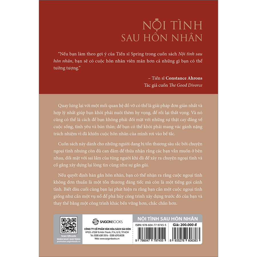 NỘI TÌNH SAU HÔN NHÂN Buông bỏ hay hàn gắn khi nửa kia ngoại tình? Tình trạng ngoại tình và ly hôn đã trở nên đáng báo động Nếu như bạn là một người hay đọc báo, lướt mạng xã hội thì chắc hẳn bạn bắt gặp không ít các loại tin đánh ghen, ngoại tình, người thứ ba. Theo số liệu của Tổng cục Thống kê, trong 10 năm qua, tỷ lệ các cặp vợ chồng ly hôn luôn tăng dần qua các năm và ngày càng trẻ hóa. Nếu bạn có người bạn đời của mình ngoại tình, hãy nhớ rằng bạn không đơn độc. Có nhiều số liệu thống kê khác nhau và theo một nghiên cứu uy tín gần đây cho biết, có tới 37% đàn ông đã kết hôn từng ngoại tình và với cánh phụ nữ thì con số này là 20%. Không ai biết tỷ lệ chính xác nhưng tôi chắc chắn rằng, nếu một người đã nói dối vợ/chồng mình thì cũng có thể nói dối nhà nghiên cứu. Với không ít người trong xã hội hiện nay, họ nghĩ chuyện ngoại tình không sai và luôn có lý do để giải thích. Nhưng trong mỗi cuộc hôn nhân, dù ngoại tình có đáng trách hay không, thì việc tiếp tục ngoại tình mà không có sự đồng thuận của cả hai bên sẽ khiến hôn nhân rạn nứt và hai vợ chồng hầu như không thể gắn bó với nhau được nữa. Như thế nào là ngoại tình? Trước khi bàn luận sâu hơn, Tiến sĩ Janis Abrahms Spring và Michael Spring đã đặt ra các câu hỏi cho chính bạn: Ngoại tình nghĩa là quan hệ tình dục? Hay chỉ cần một nụ hôn? Thế còn những buổi hẹn hò ăn uống cùng nhau thì sao? Tác giả không cố trả lời những câu hỏi kiểu như vậy vì suy cho cùng, điều gì quan trọng với bạn mới là điều đáng bàn. Niềm tin tan vỡ hay không tùy thuộc vào việc bạn đồng ý và tin tưởng điều gì. Hầu như tất cả mọi người đều cảm thấy bị phản bội khi bạn đời quan hệ tình dục với người khác, cho dù đó là tình một đêm hay một mối quan hệ lâu dài có nảy sinh tình cảm. Nhiều người cũng cảm thấy bị phản bội, và chắc chắn là thấy bất an, trước những hành động thân mật như một cái ôm, lời âu yếm hay tin nhắn thân mật. Cách đây 5 năm, Sharon tìm đến tác giả nhờ tư vấn vì chị đã gửi một bức ảnh bán khỏa thân cho bạn trai cũ. Chuyện chỉ dừng lại ở đấy, nhưng chồng chị đã đau khổ suốt kể từ khi biết chuyện. Trong lần ấn bản thứ ba này, tác giả có bổ sung thêm một chương về những thử thách trong mối quan hệ mà các đợt ấn bản trước chưa đề cập tới. Phần này được kể lại một số tình huống mà một số người đã phải vật vã tự đấu tranh, kèm theo những đề xuất cụ thể của nhà tâm lý, Tiến sĩ Spring để giúp họ xoa dịu nỗi đau. Nội tình sau hôn nhân - “công cụ” hữu ích cho mọi cuộc hôn nhân rạn nứt vì ngoại tình Cuốn sách này sẽ đem lại cái nhìn sâu sắc về lý do dẫn đến chuyện ngoại tình, ảnh hưởng của ngoại tình đến cả hai người trong hôn nhân, dù là người bị tổn thương hay người không chung thủy. Với người không chung thủy, có thể bạn sẽ thấy nhẹ nhõm sau khi nói ra hoặc bị phát hiện vì “Tôi quá mệt vì phải nói dối!”, hay những lần cáu gắt “Anh quay về rồi. Em còn muốn gì nữa?” vì bị vợ trách móc, chì chiết. Có người sẽ tìm lý do cho bản thân “Làm điều mình muốn là sai sao?”, “Hôn nhân đúng là mồ chôn tình yêu!” nhưng cũng có người “Tôi chẳng dám nhớ lại chuyện cũ!”, “Tôi thấy kinh tởm chính mình!” Với người bị tổn thương, bạn sẽ gặp những rối loạn, tổn thương về tâm sinh lý. Đồng thời cũng sẽ có những cuộc đấu tranh nội tâm “Gương đã vỡ, liệu có thể lành?”, “ăn vụng một lần có thành quen thói?”, “Ta có nên cố gắng vì con?” Và dù bạn có là ai trong mối quan hệ này, Nội tình sau hôn nhân vẫn là một cẩm nang tinh tế và đầy hy vọng để chữa lành nỗi đau. Ngoài việc tăng thêm góc nhìn một cách thấu đáo về ngoại tình, đây sẽ là một công cụ quan trọng để xây dựng lại mối quan hệ sau khi một người đã ngoại tình. Ai có nên đọc Nội tình sau hôn nhân? Tiến sĩ Spring viết Nội tình sau hôn nhân dành cho bất kỳ cặp đôi nào – có thể là các đôi vợ chồng đã kết hôn, các cặp đôi dị tính hay đồng tính – muốn hàn gắn lại mối quan hệ sau khi một hoặc cả hai người đã ngoại tình. Nhưng đồng thời, Nội tình sau hôn nhân cũng dành cho: