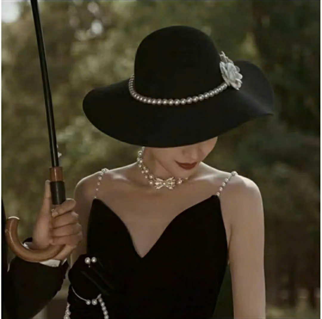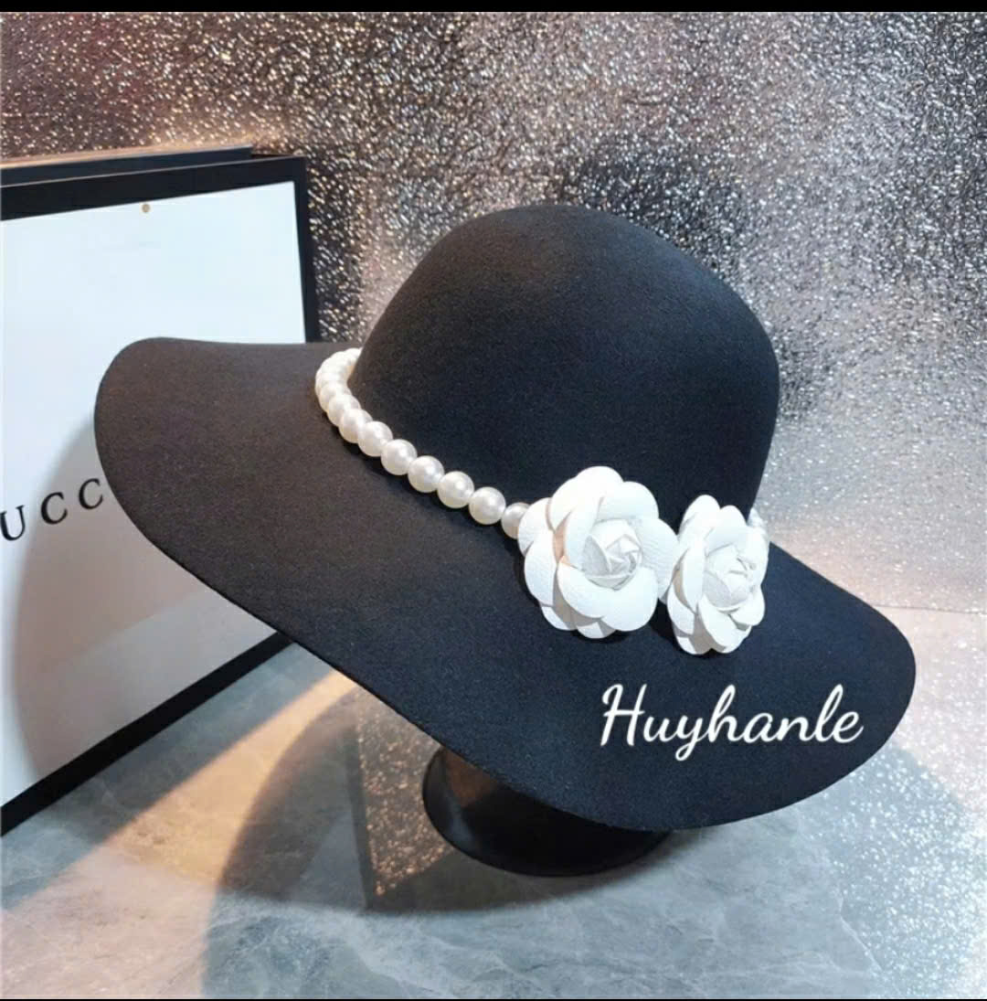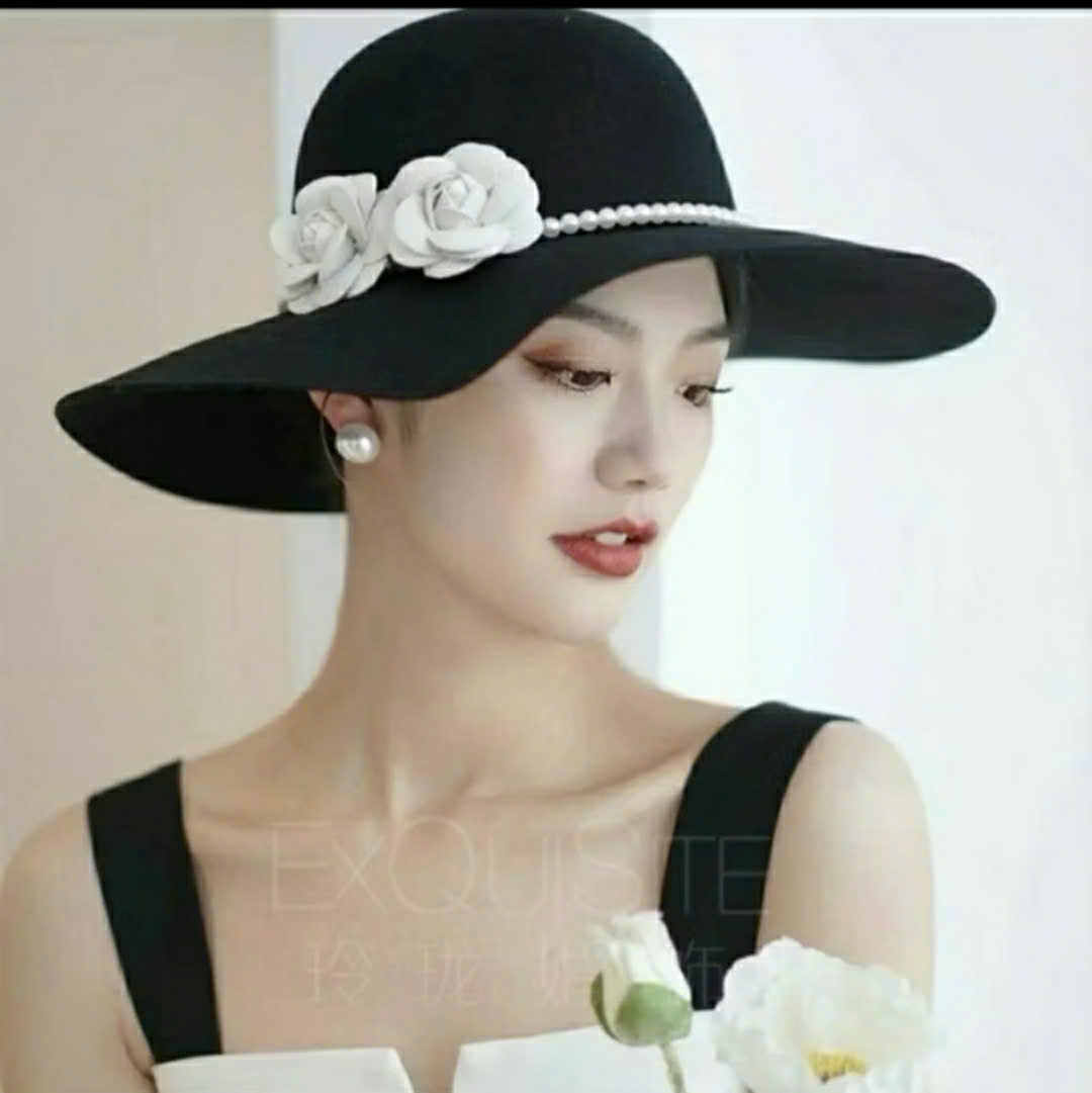 Mua tại TiktokNón mũ nỉ rộng vành Fedora kết 2 hoa voan kiếng phối đai ngọc trai nhân tạo
