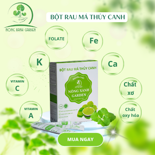 Hộp Bột Rau Má Thủy Canh Nguyên Chất Nông Xanh Garden 45GR Thực phẩm bổ sung Bột rau má với thành phần từ Rau má thủy canh tươi sau khi thu hoạch được làm sạch bằng phương pháp sục Ozone. Sau đó, kết hợp kỹ thuật sấy lạnh với công nghệ nghiền cối đá siêu mịn từ Nhật Bản nên giữ nguyên vẹn được giá trị dinh dưỡng, hương vị, màu sắc của rau má thủy canh nguyên chất.
