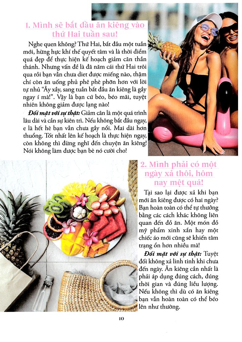 Bên cạnh những cách ăn kiêng khoa học và có tính khả thi cao như ăn kiêng kiểu Địa Trung Hải, paleo, pegan hay cân bằng kiềm, cuốn cẩm nang còn “bỏ nhỏ” cho nàng rất nhiều bí kíp tập tành, dựng style thời trang mùa Hè du lịch, chăm sóc da và trang điểm để có được phần ngoài thu hút nhất được chia sẻ bởi những hot beauty blogger và fashionista như Hana Giang Anh, Daul Be hay Julia Đoàn.