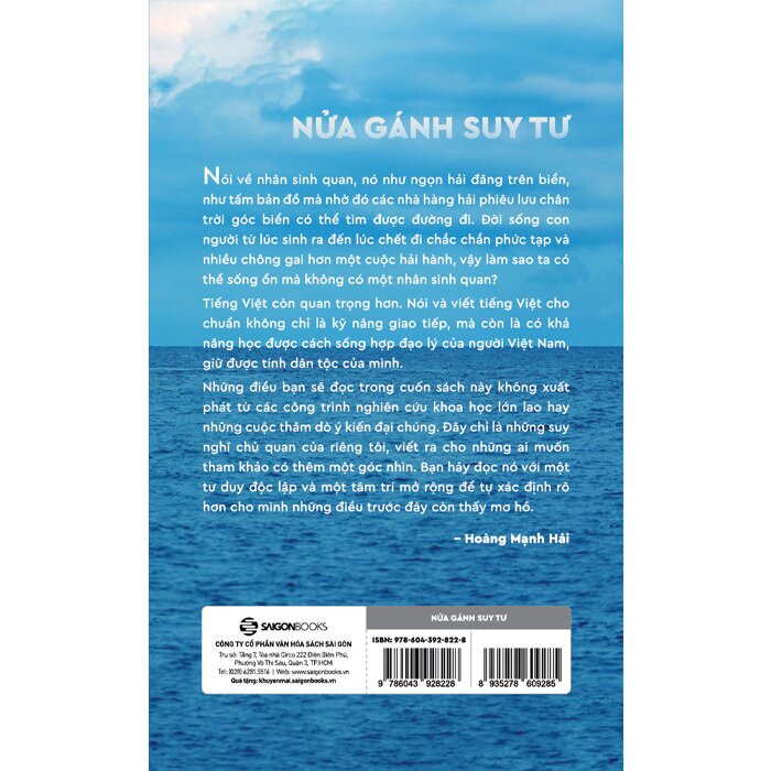 "Nửa Gánh Suy Tư" là hành trình sâu sắc khám phá giá trị nhân sinh, tư duy và tiếng Việt. Tác giả Hoàng Mạnh Hải, qua hơn một thập kỷ học hỏi và chiêm nghiệm, đã mang đến những trang viết đầy ý nghĩa, giúp độc giả tìm thấy ánh sáng tri thức trong hành trình sống của chính mình.